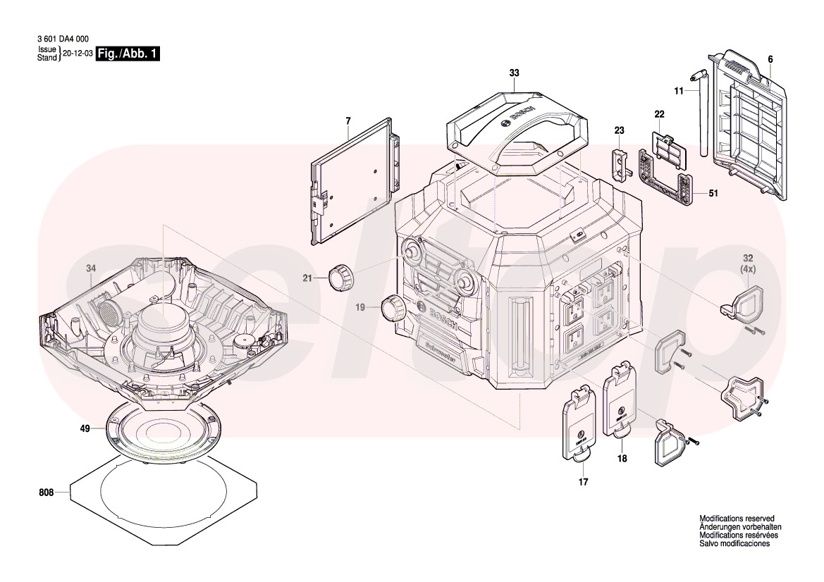 Запчасти для аккумуляторного радио BOSCH GPB 18V-5 SC (3601DA4100) (схема 1), взрыв-схема: