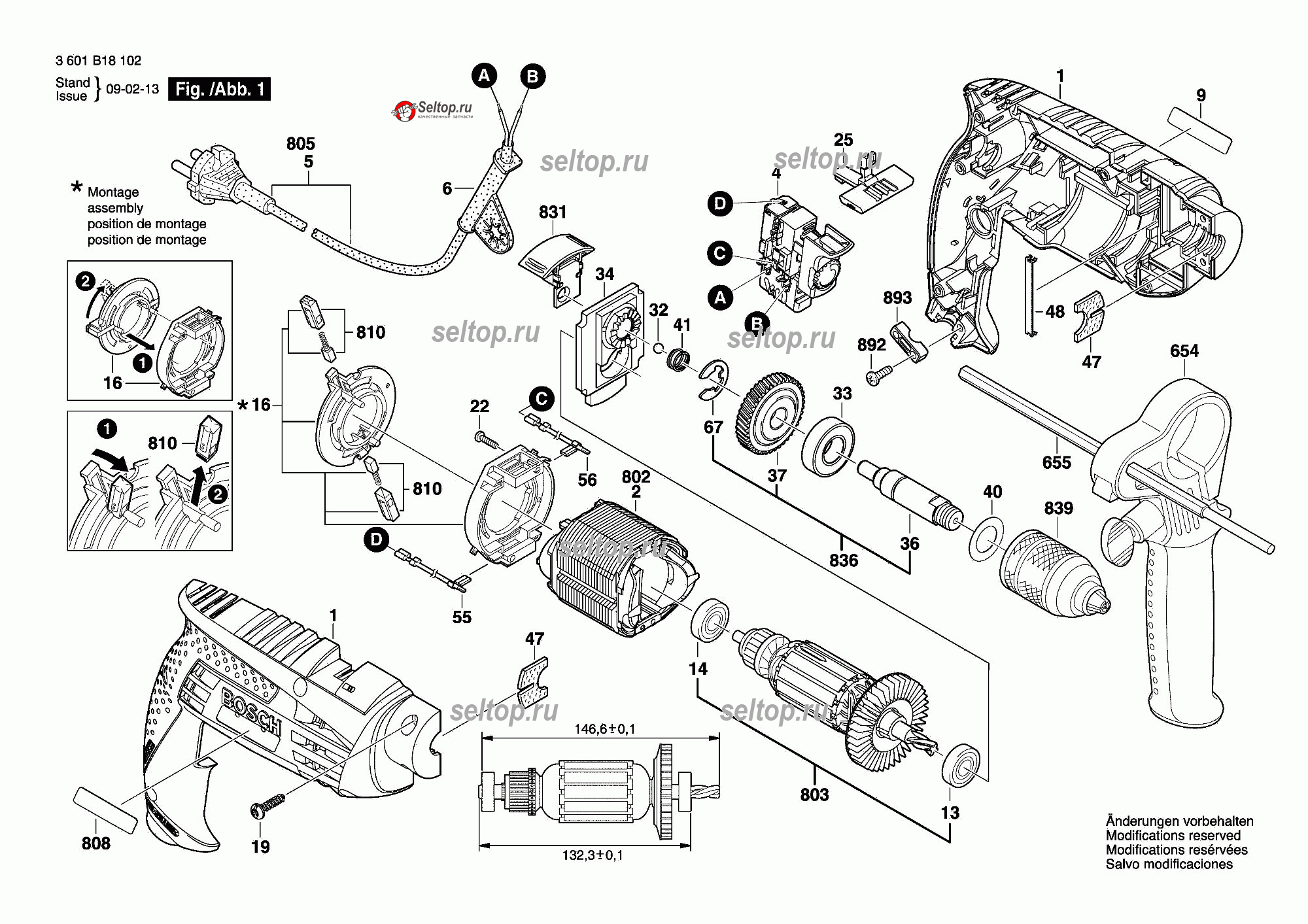 Запчасти для дрели Bosch GSB 1600 RE (3601B18102), взрыв-схема: