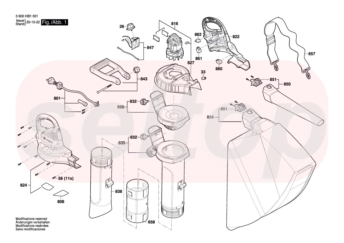 Запчасти для воздуходувки BOSCH UniversalGardenTidy (артикул модели 3600HB1001), взрыв-схема: