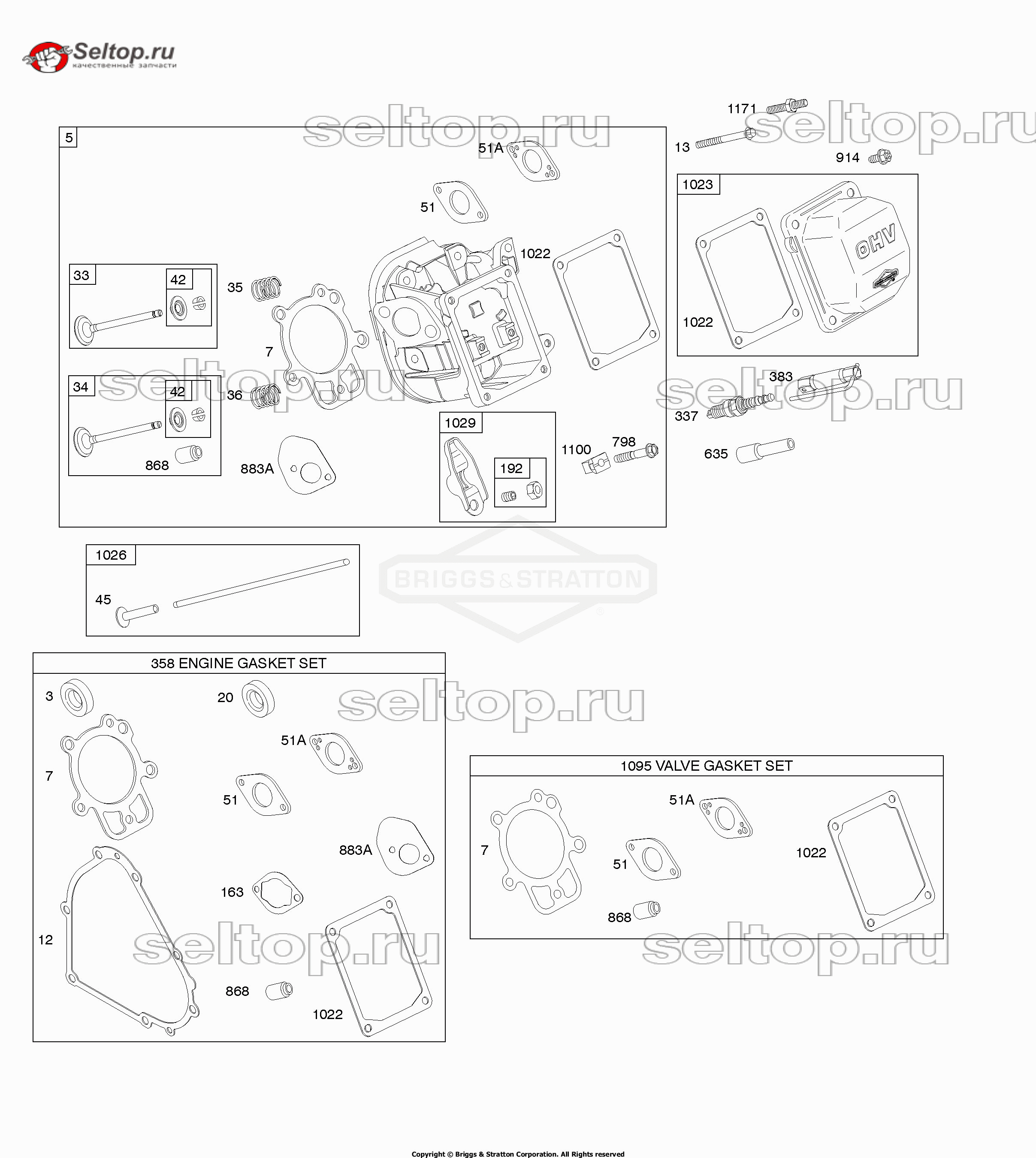 Головка цилиндра, комплект прокладок - двигатель, комплект прокладок - клапан, клапаны Briggs Stratton 205337-1185-H1