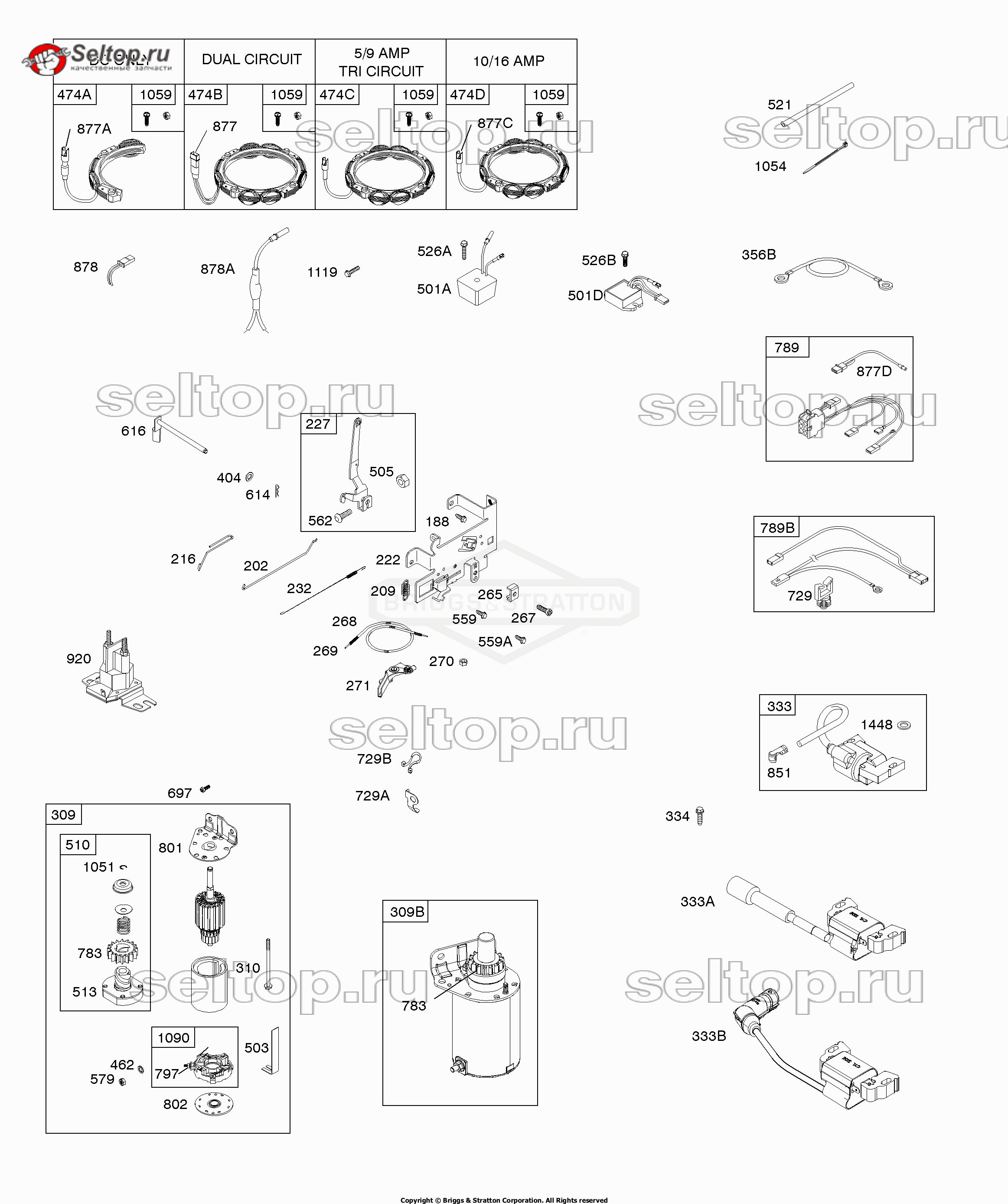 Генератор переменного тока, система управления, провод, электростартер, пружина регулятора, зажигание Briggs Stratton 31R777-0002-B1