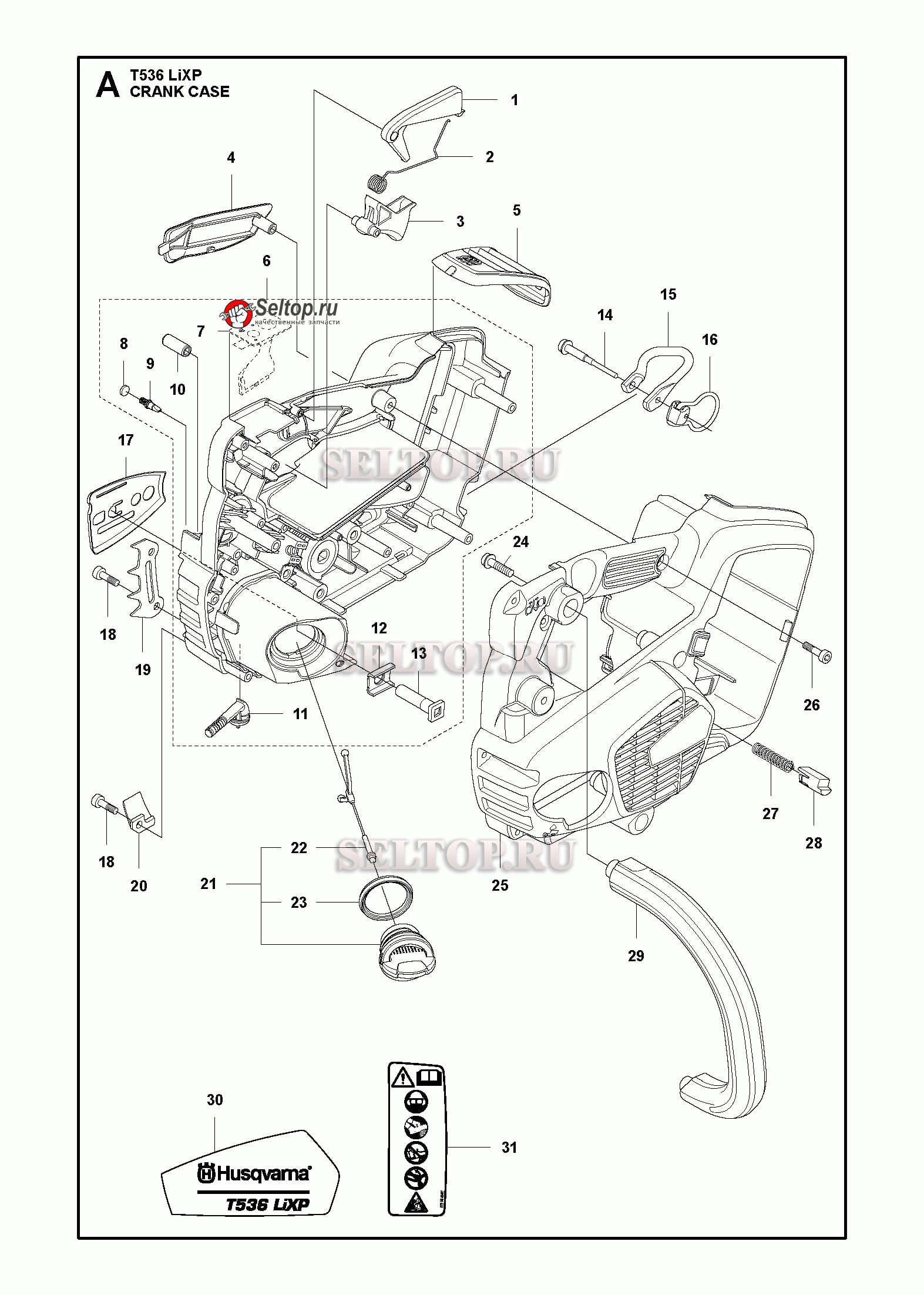 Картер для аккумуляторной цепной пилы Husqvarna T536 Li XP, взрыв-схема: