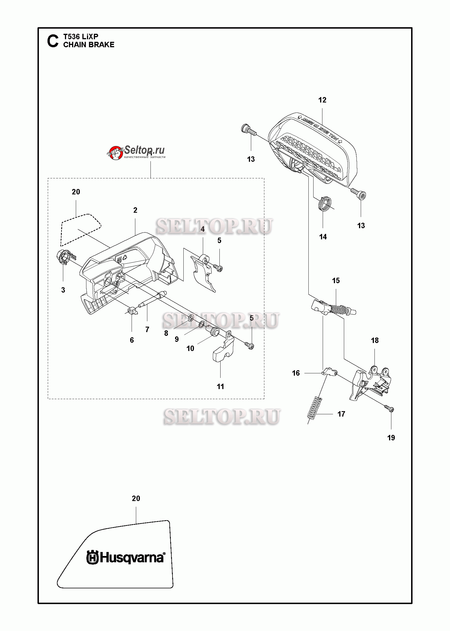 Тормоз цепи для аккумуляторной цепной пилы Husqvarna T536 Li XP, взрыв-схема: