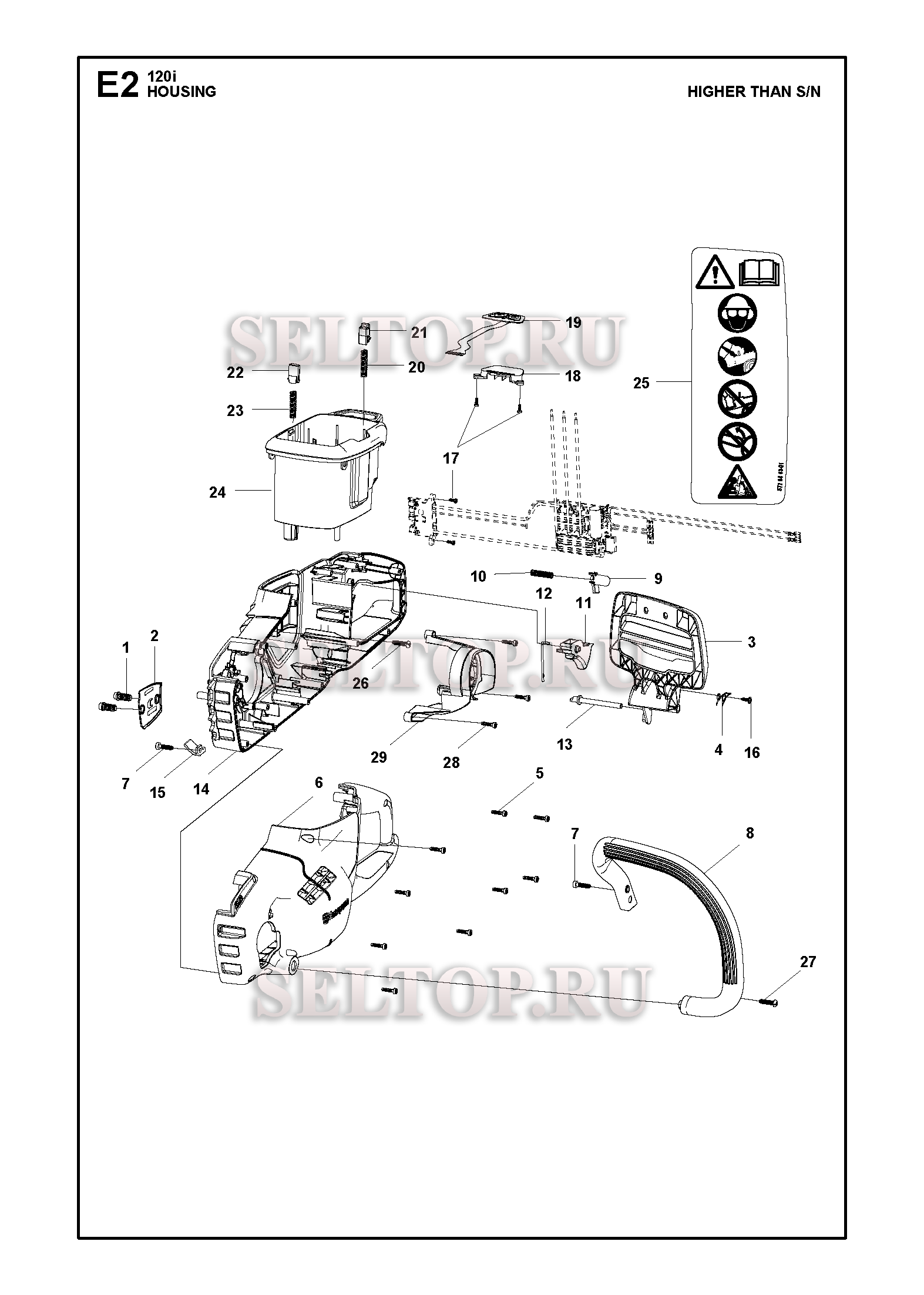 Корпус для бензопилы Husqvarna 120i артикул 967098201, 967098202, 967098203, 967098101, 967098104 (с 2018-02), взрыв-схема: