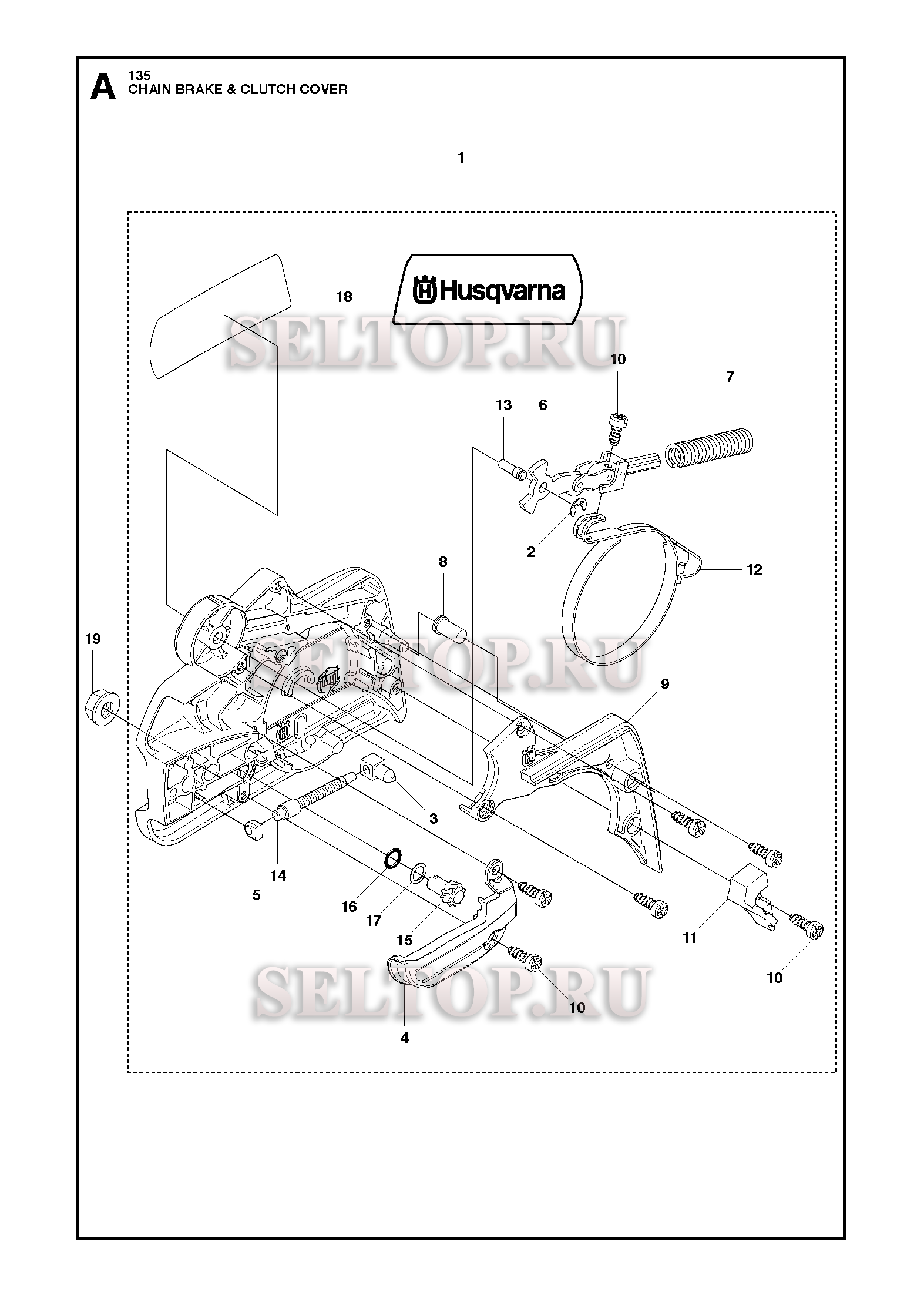 Тормоз цепи, крышка сцепления для бензопилы Husqvarna 135 (с 2011-08), взрыв-схема:
