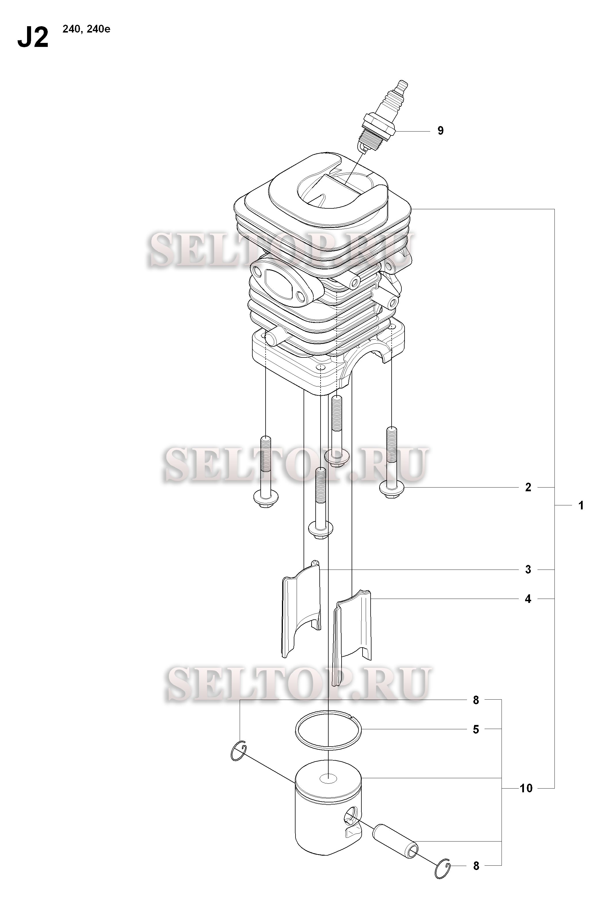 Поршень, цилиндр для бензопилы Husqvarna 240 (с 2008-01), взрыв-схема: