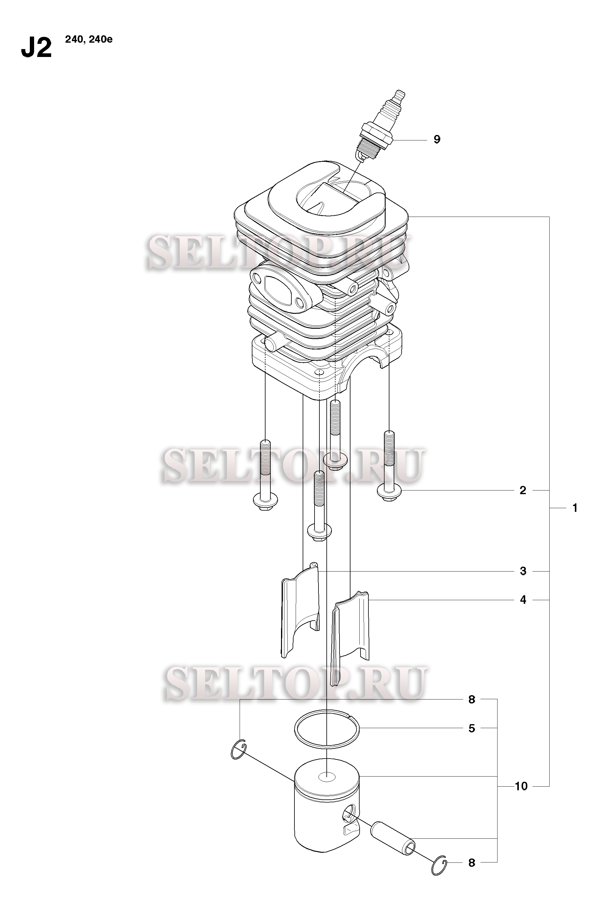 Поршень, цилиндр для бензопилы Husqvarna 240 (с 2009-04), взрыв-схема: