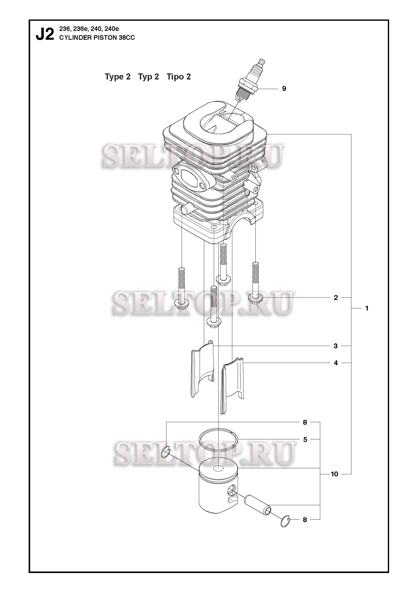 Поршень, цилиндр для бензопилы Husqvarna 240 (с 2014-10), взрыв-схема: