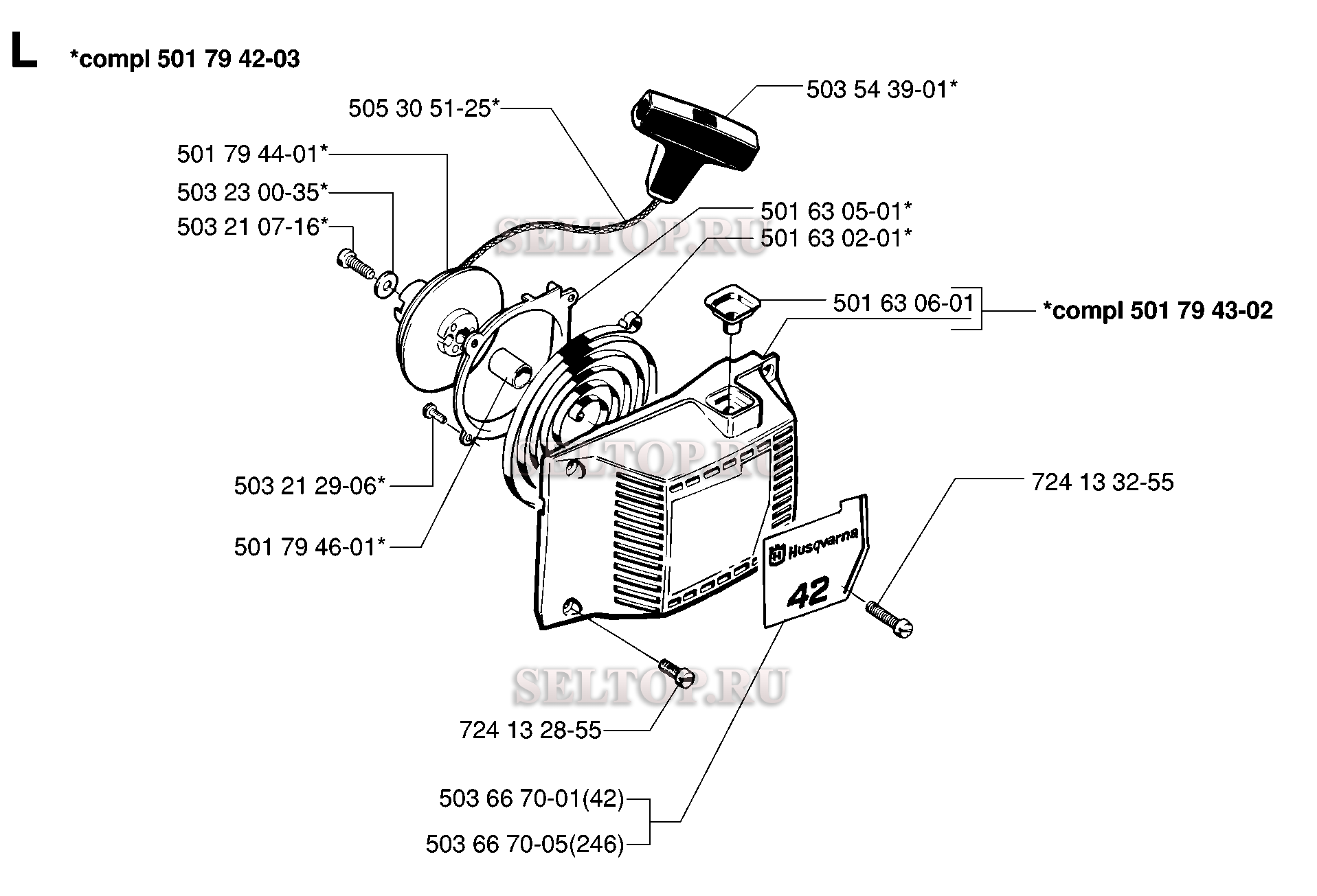 Стартер для бензопилы Husqvarna 246 (с 1994-12), взрыв-схема: