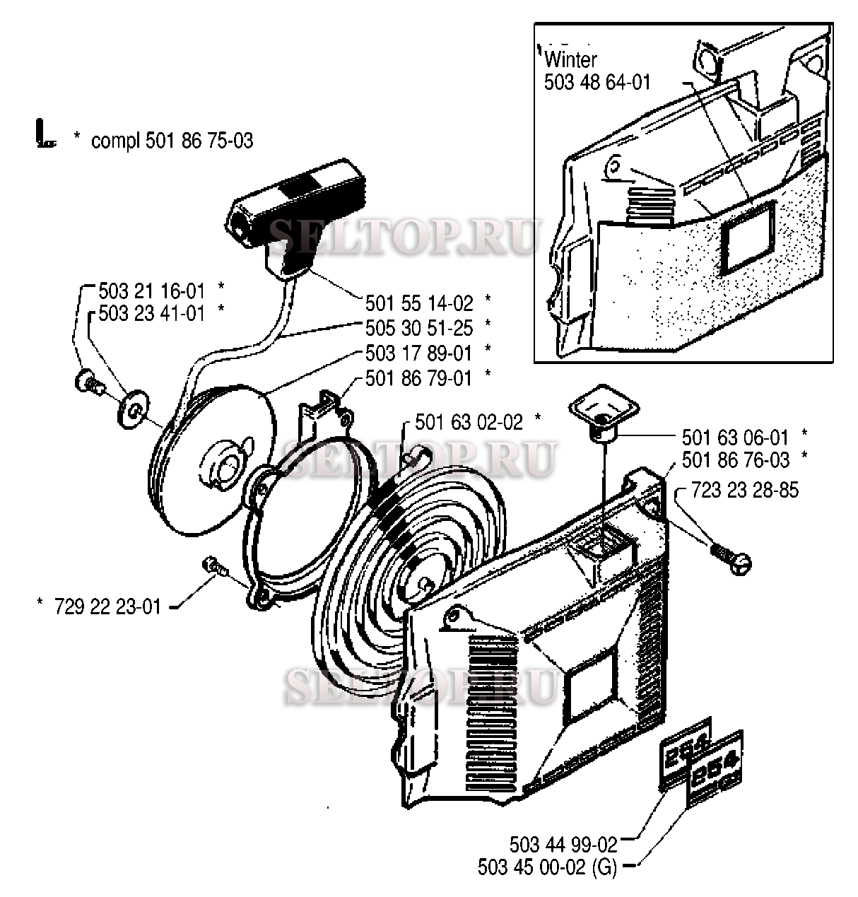 Стартер для бензопилы Husqvarna 254 (с 1990-05), взрыв-схема: