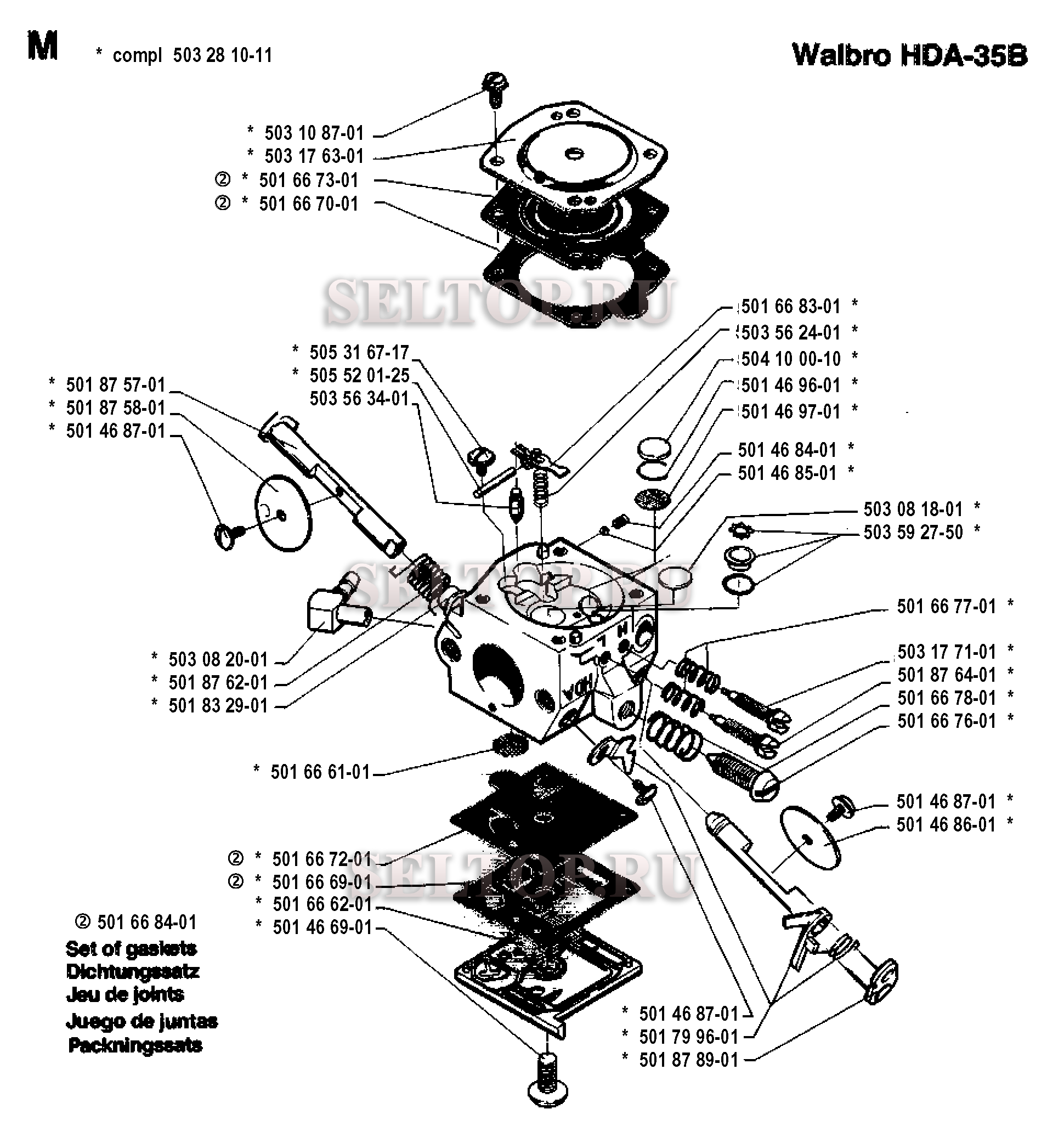 Запчасти карбюратора для бензопилы Husqvarna 254 (с 1994-06), взрыв-схема: