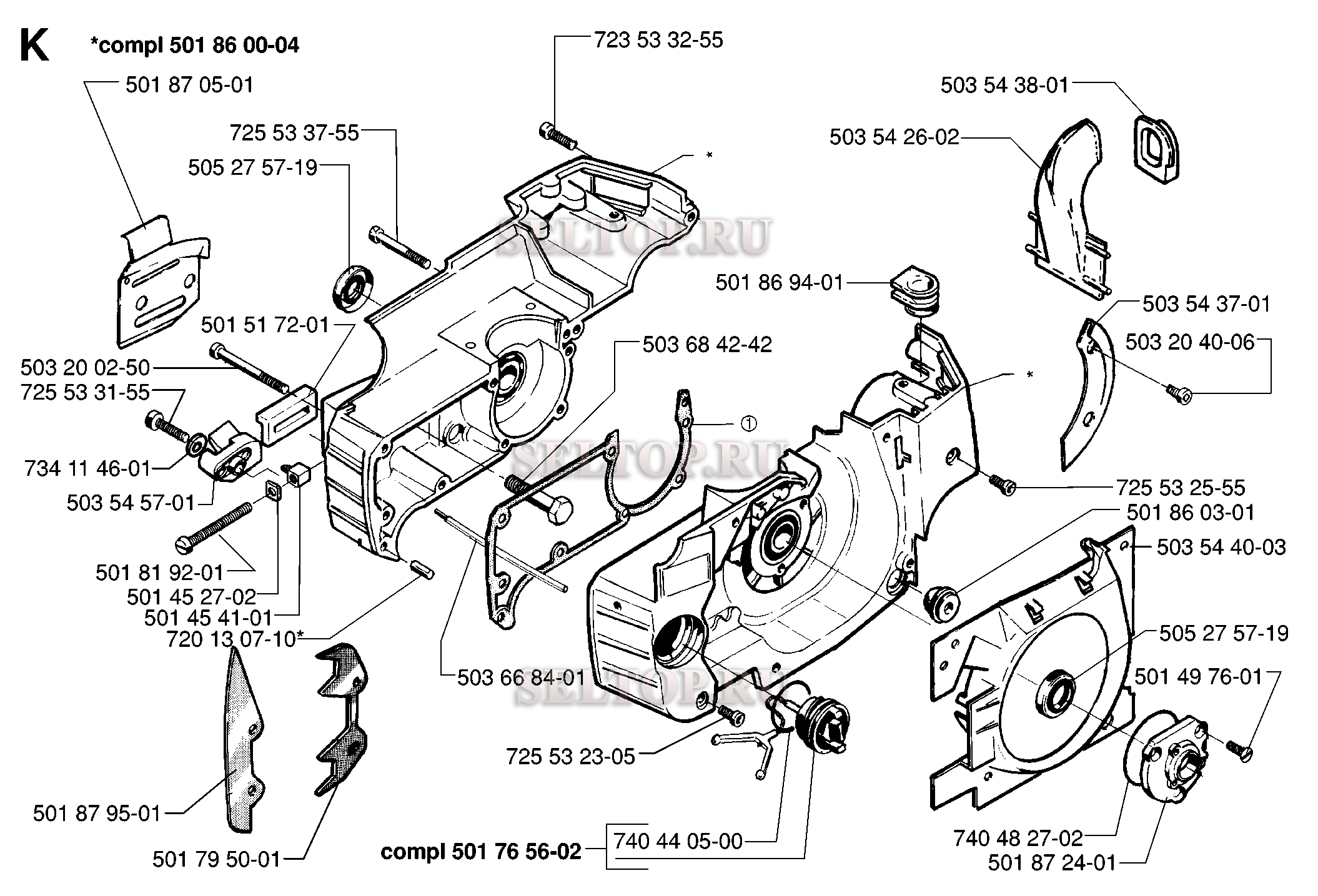Картер для бензопилы Husqvarna 254 (с 1996-01), взрыв-схема: