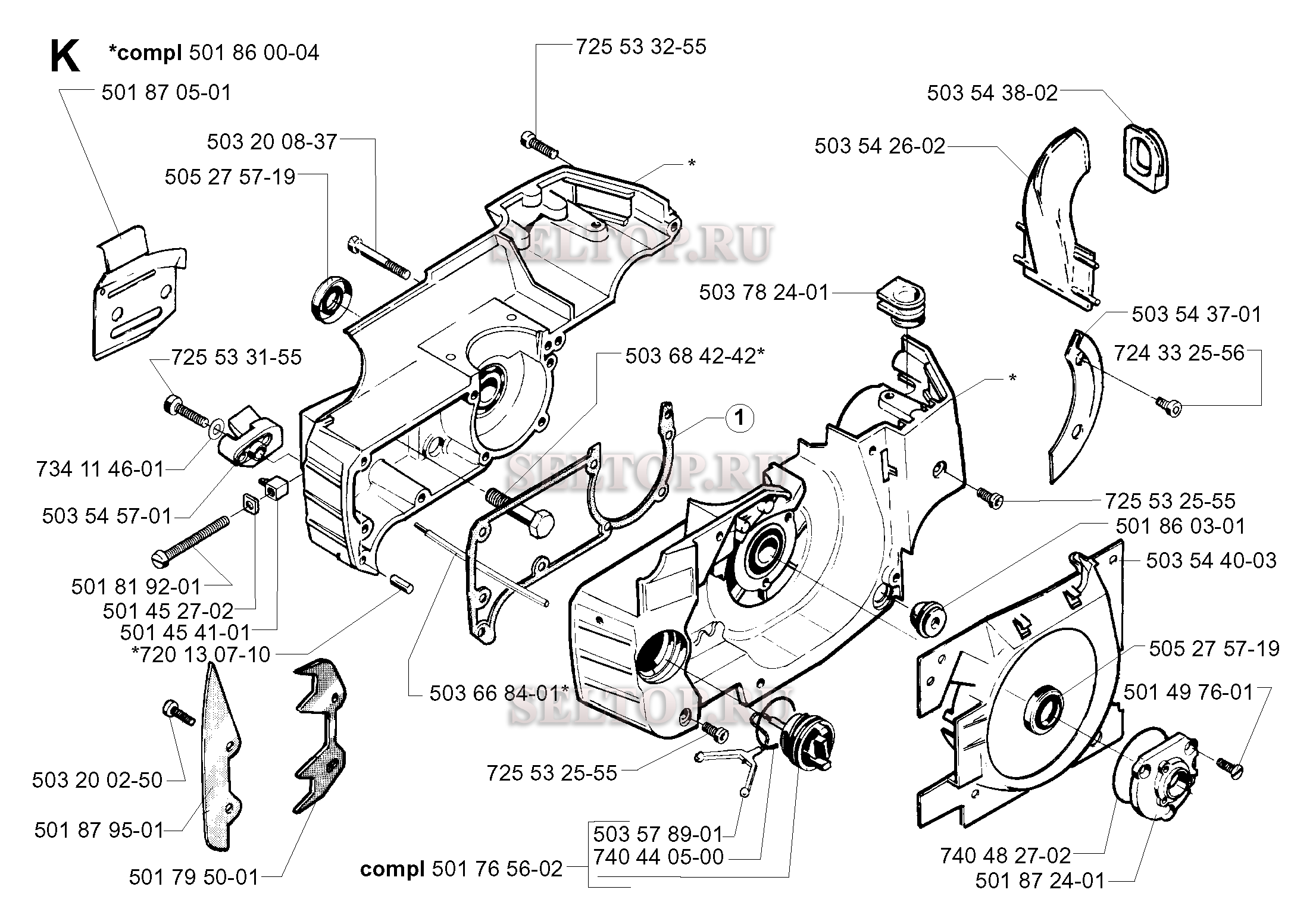 Картер для бензопилы Husqvarna 254 (с 2001-09), взрыв-схема: