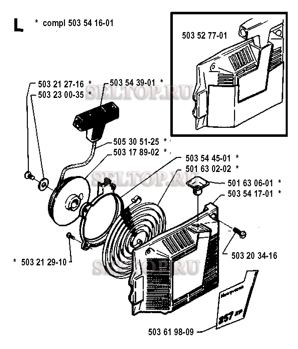 Стартер для бензопилы Husqvarna 257 (с 1994-06), взрыв-схема:
