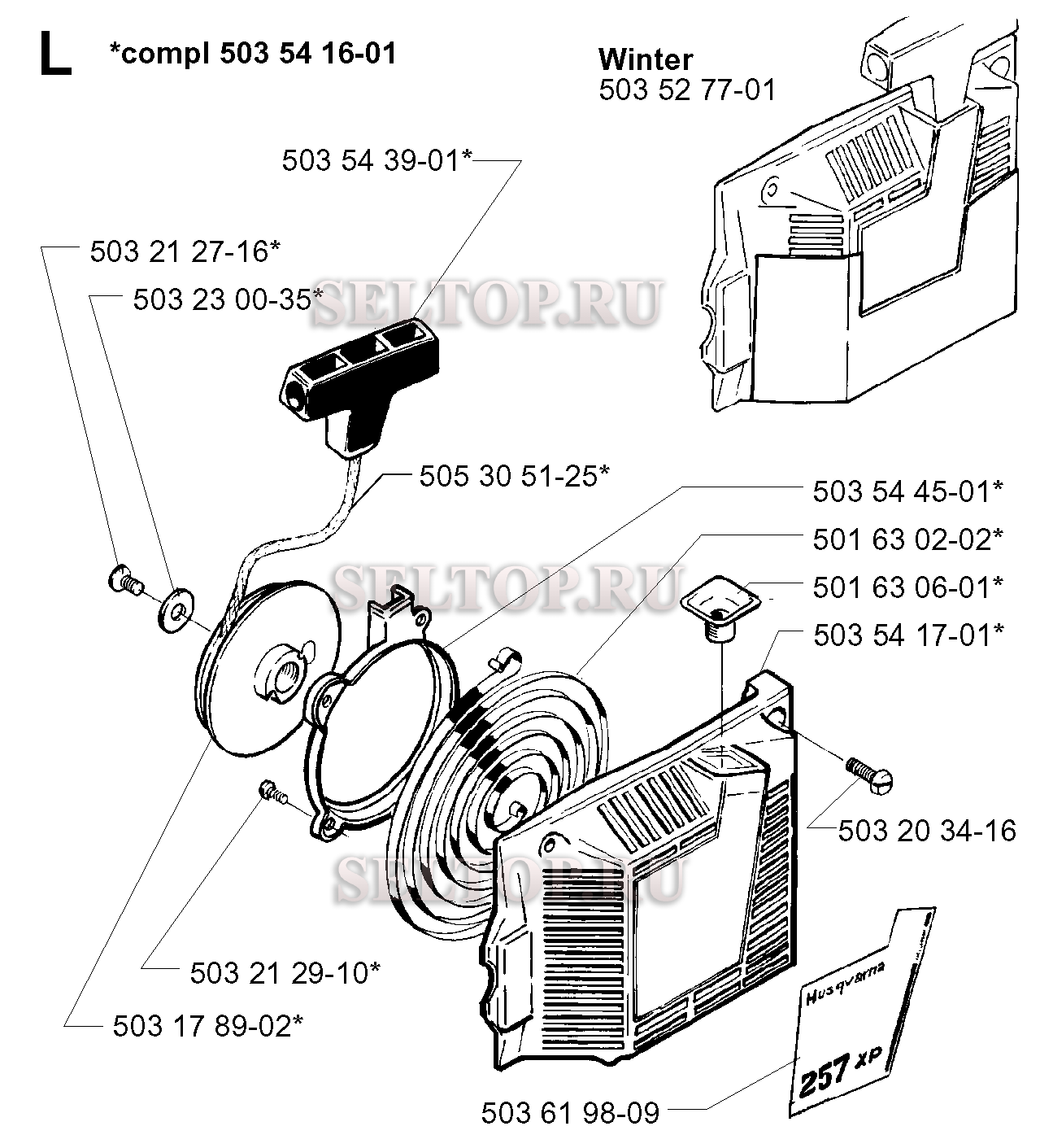 Стартер для бензопилы Husqvarna 257 (с 1996-01), взрыв-схема: