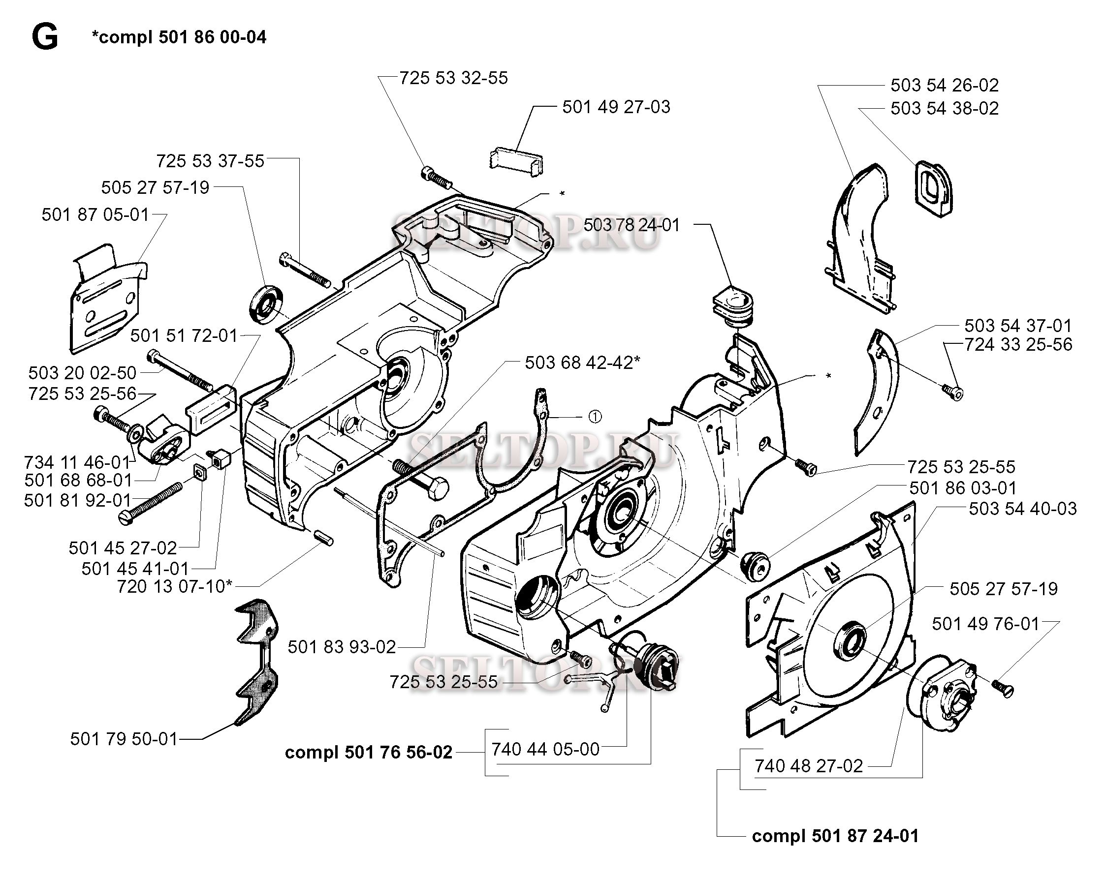 Картер для бензопилы Husqvarna 257 (с 1998-03), взрыв-схема:
