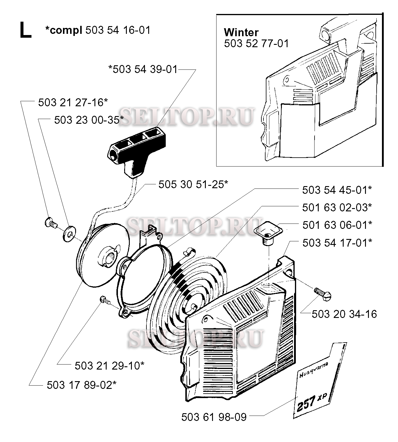 Стартер для бензопилы Husqvarna 257 (с 2001-09), взрыв-схема: