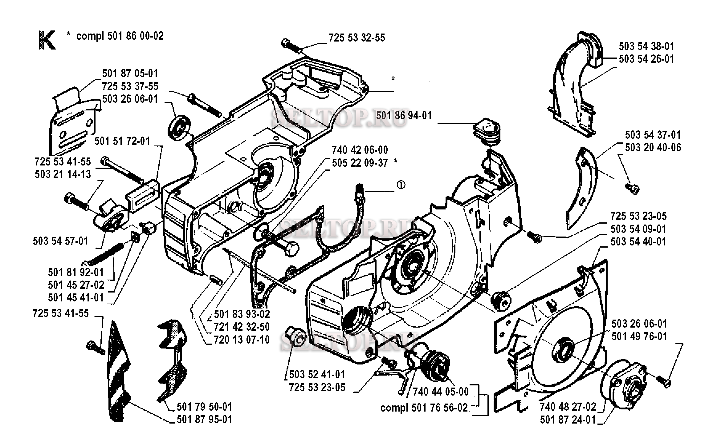 Картер для бензопилы Husqvarna 262 XP (с 1991-03), взрыв-схема: