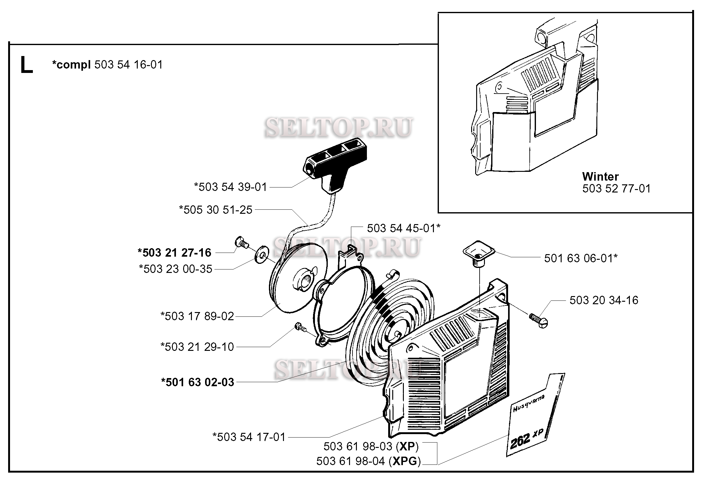 Стартер для бензопилы Husqvarna 262 XP (с 1999-06), взрыв-схема: