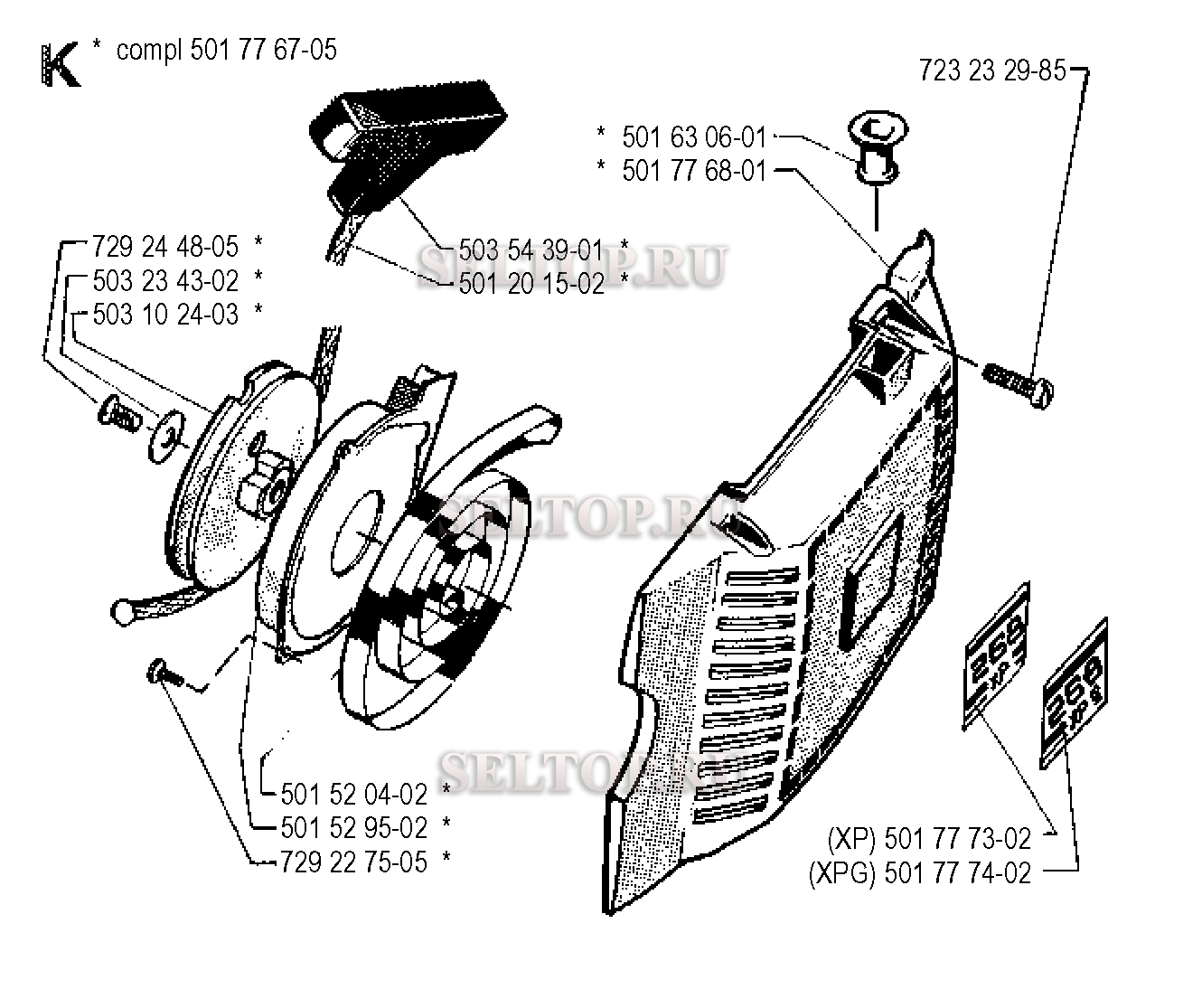 Стартер для бензопилы Husqvarna 268 (с 1990-05), взрыв-схема: