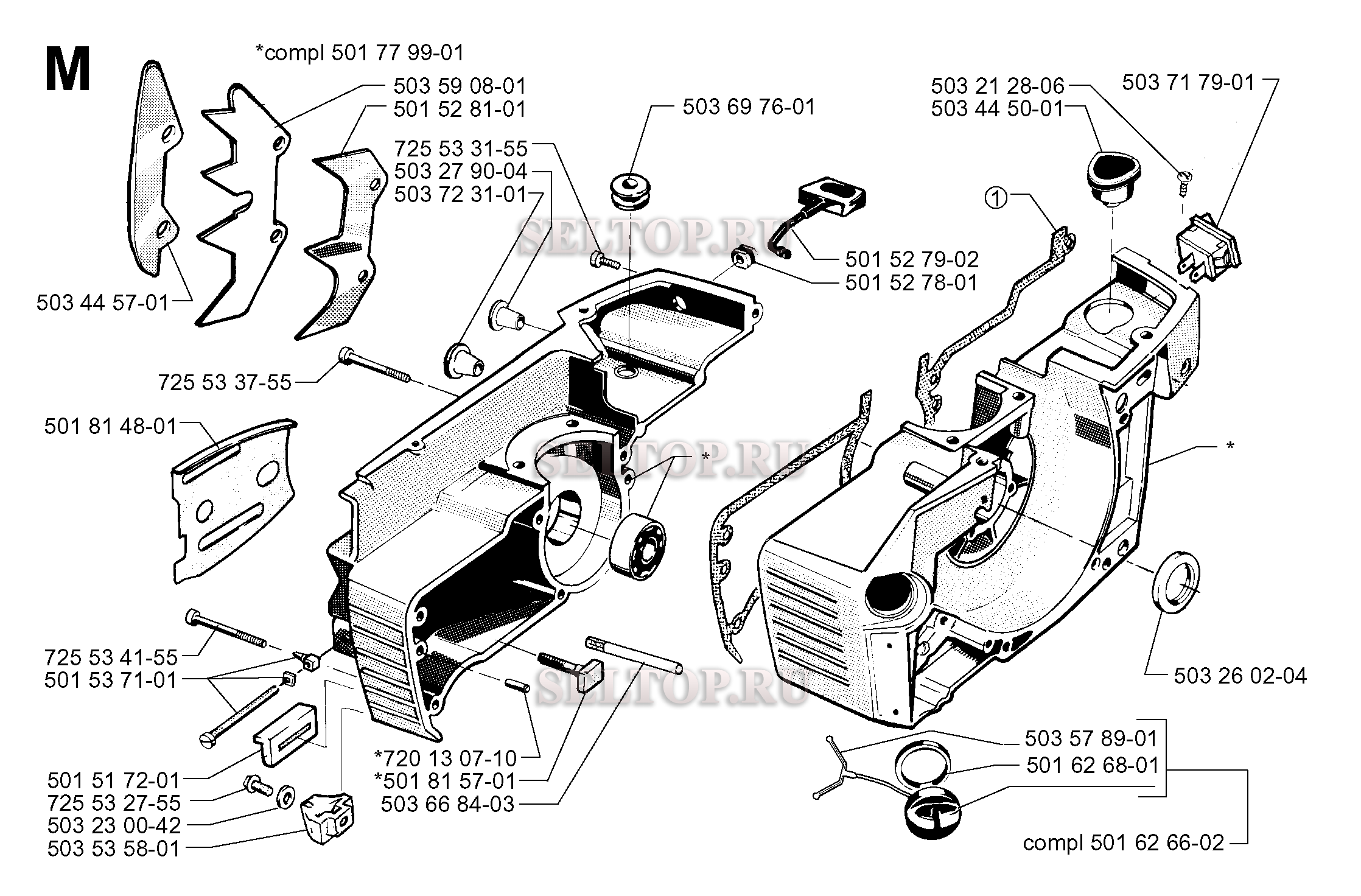 Картер для бензопилы Husqvarna 268 (с 2001-10), взрыв-схема: