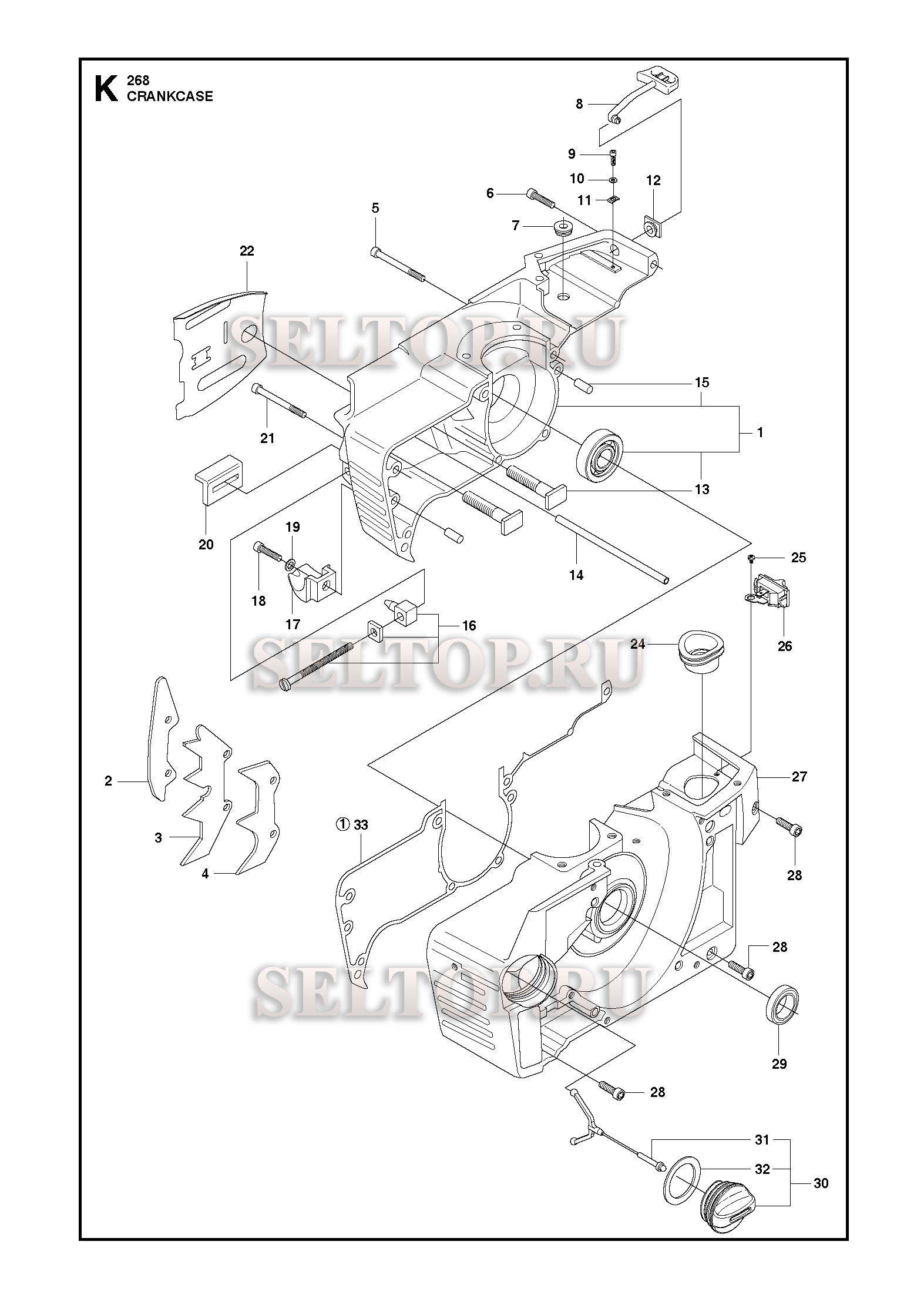 Картер для бензопилы Husqvarna 268 (с 2018-06), взрыв-схема: