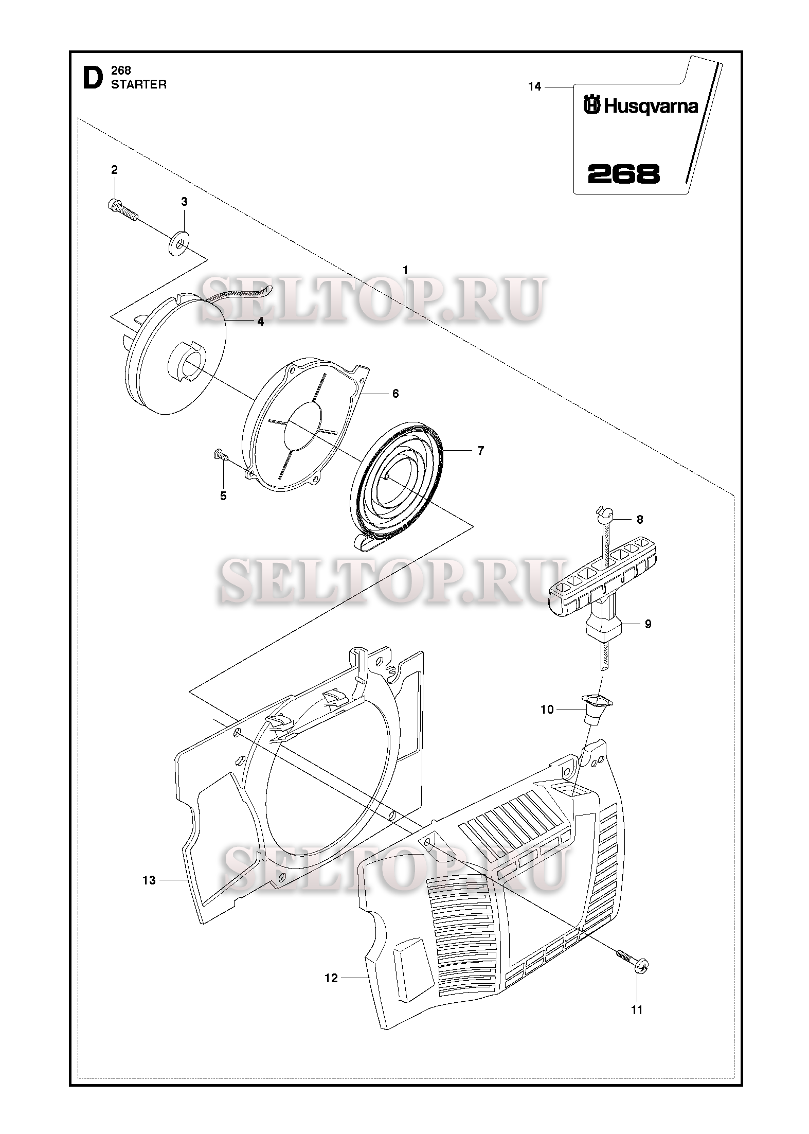 Стартер для бензопилы Husqvarna 268 (с 2018-06), взрыв-схема: