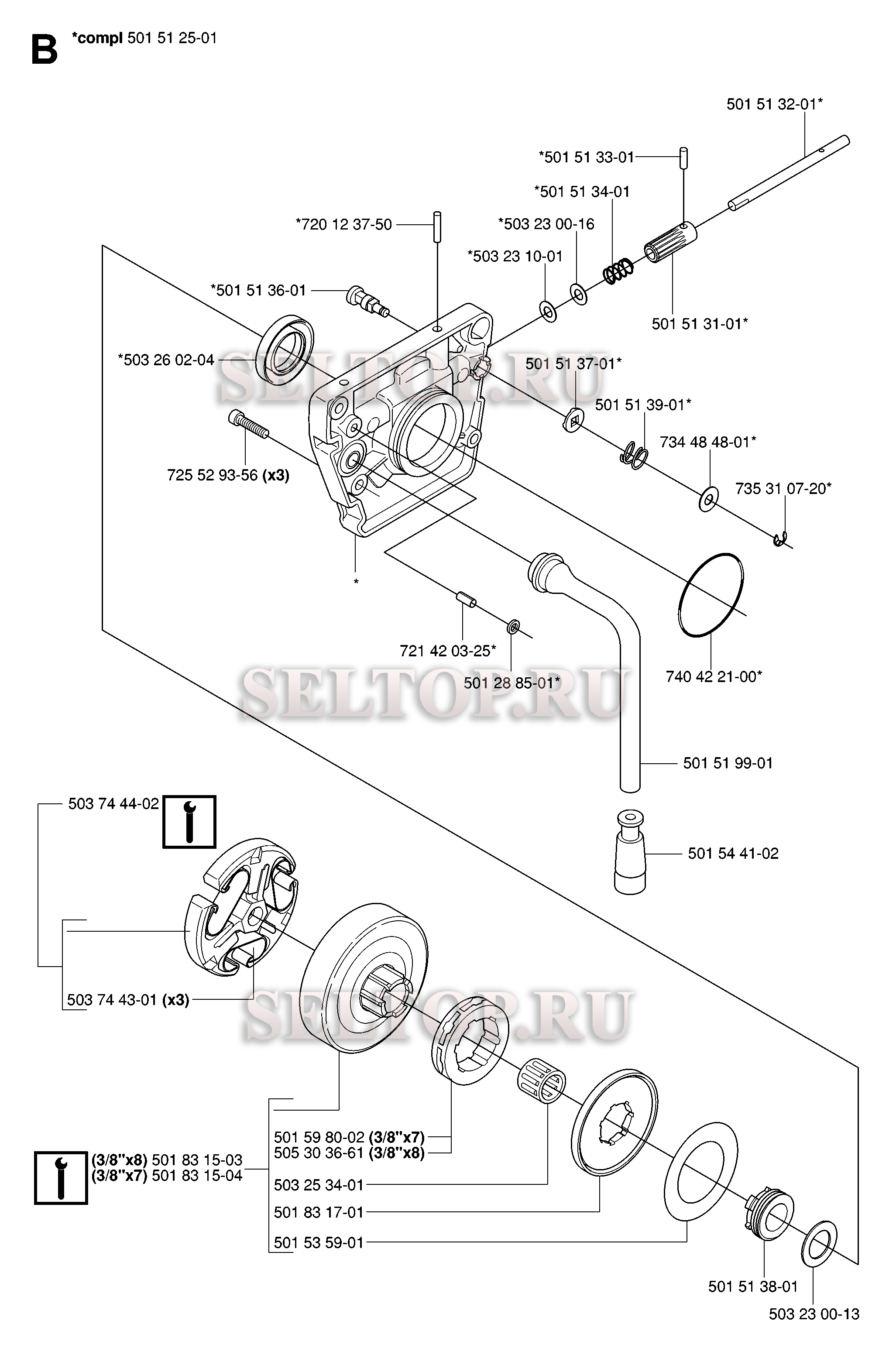 Сцепление, масляный насос для бензопилы Husqvarna 272 XP (с 2007-01), взрыв-схема: