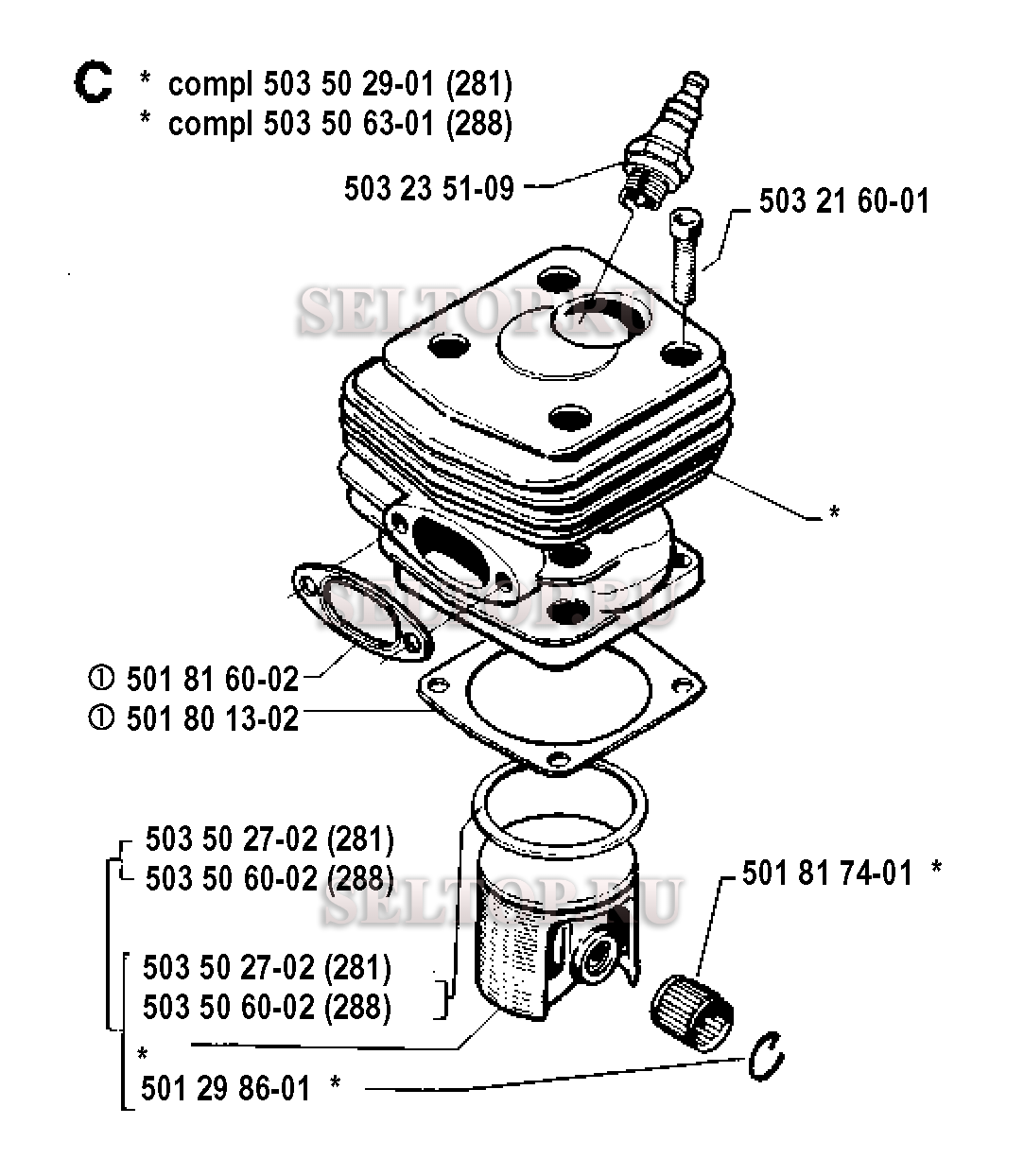 Поршень, цилиндр для бензопилы Husqvarna 288 (с 1990-01), взрыв-схема: