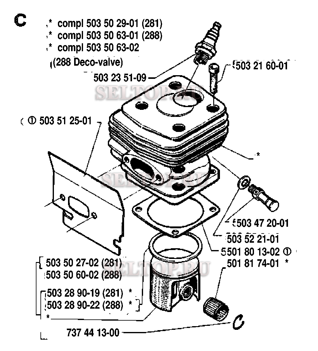 Поршень, цилиндр для бензопилы Husqvarna 288 (с 1991-04), взрыв-схема: