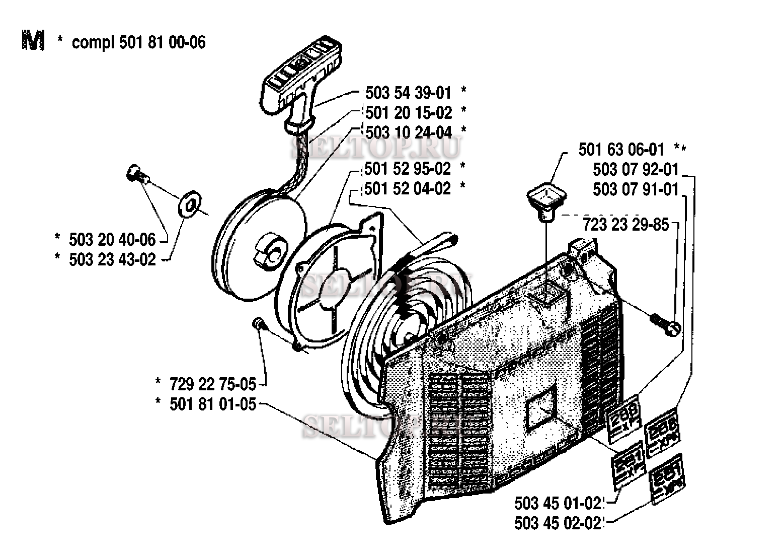 Стартер для бензопилы Husqvarna 288 (с 1991-04), взрыв-схема: