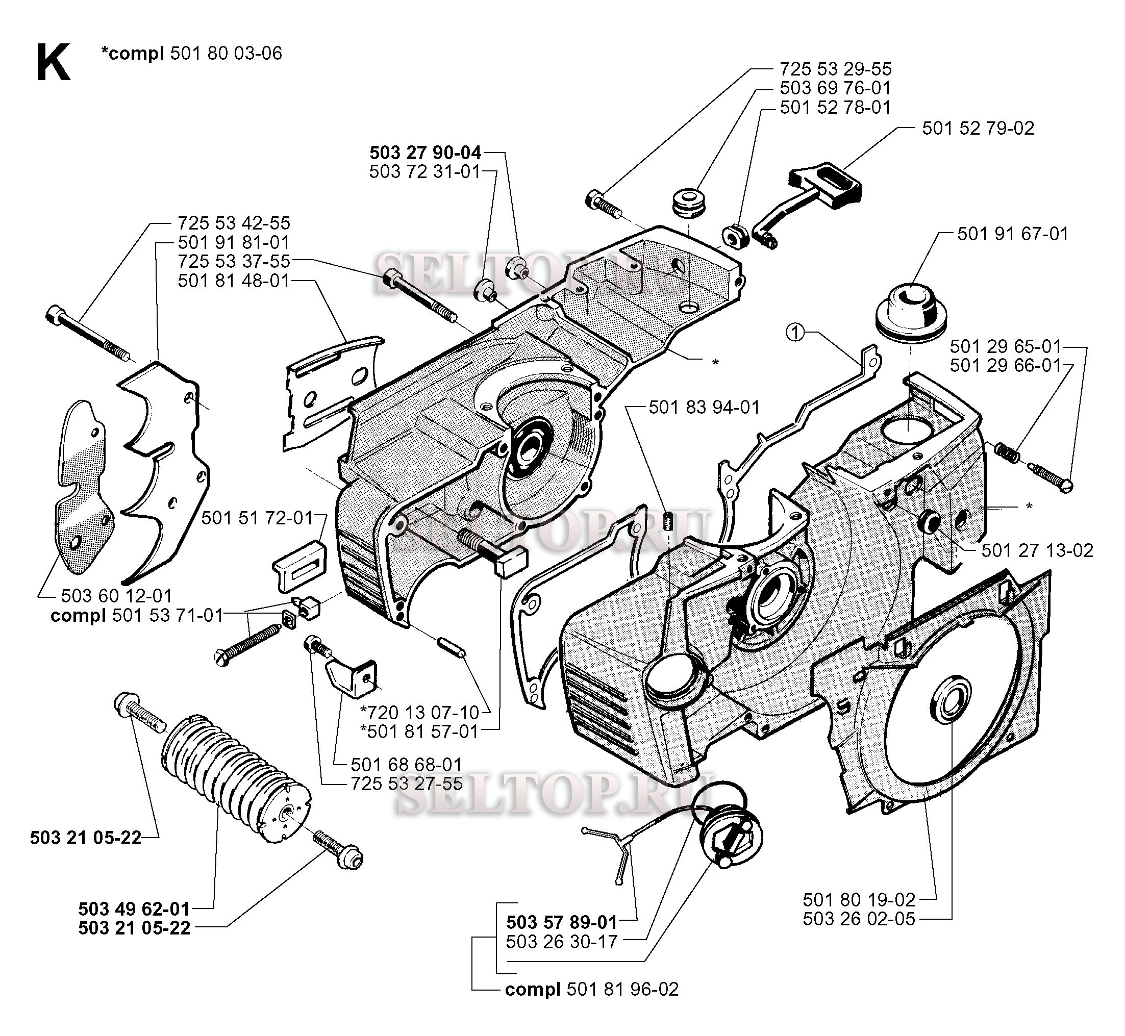 Картер для бензопилы Husqvarna 288 (с 2000-02), взрыв-схема: