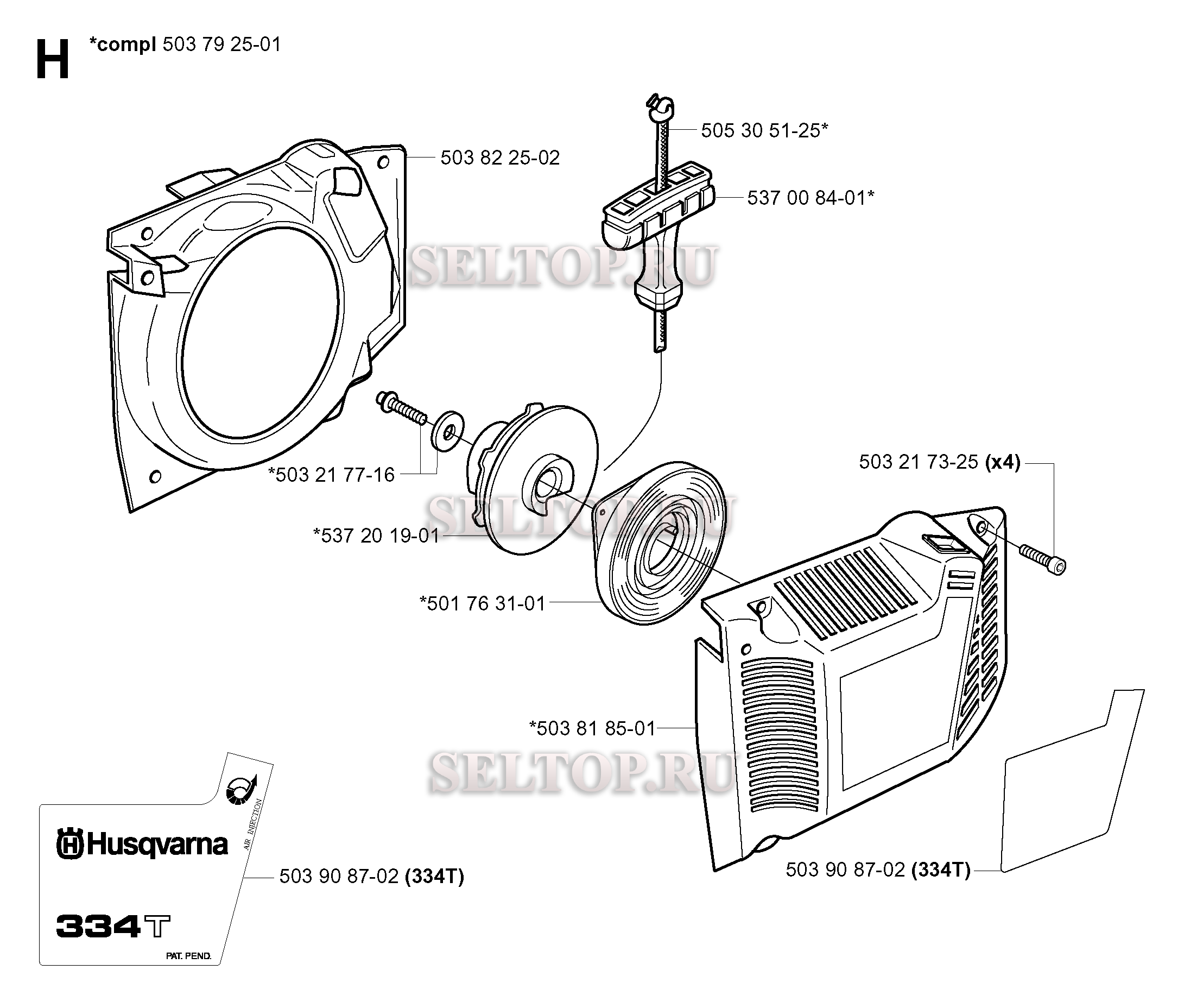 Стартер для бензопилы Husqvarna 334 T (с 2003-11), взрыв-схема: