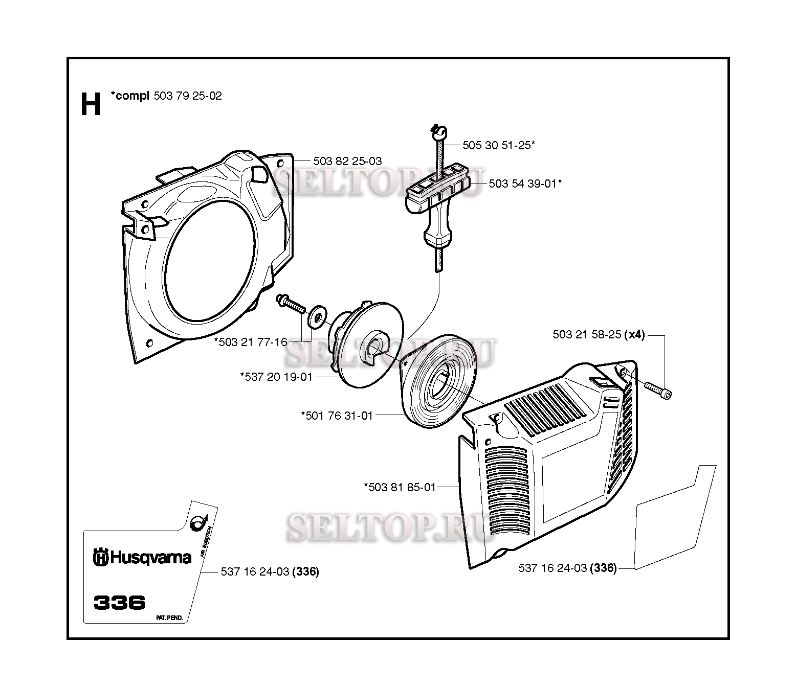Стартер для бензопилы Husqvarna 336 (с 2005-03), взрыв-схема: