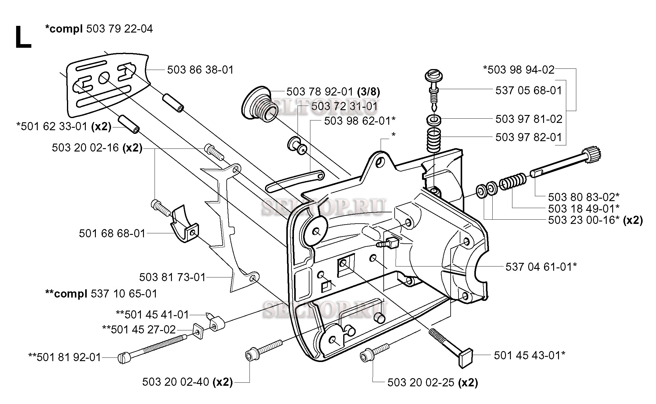 Картер для бензопилы Husqvarna 338 XPT CALIFORNIA (с 2004-08), взрыв-схема: