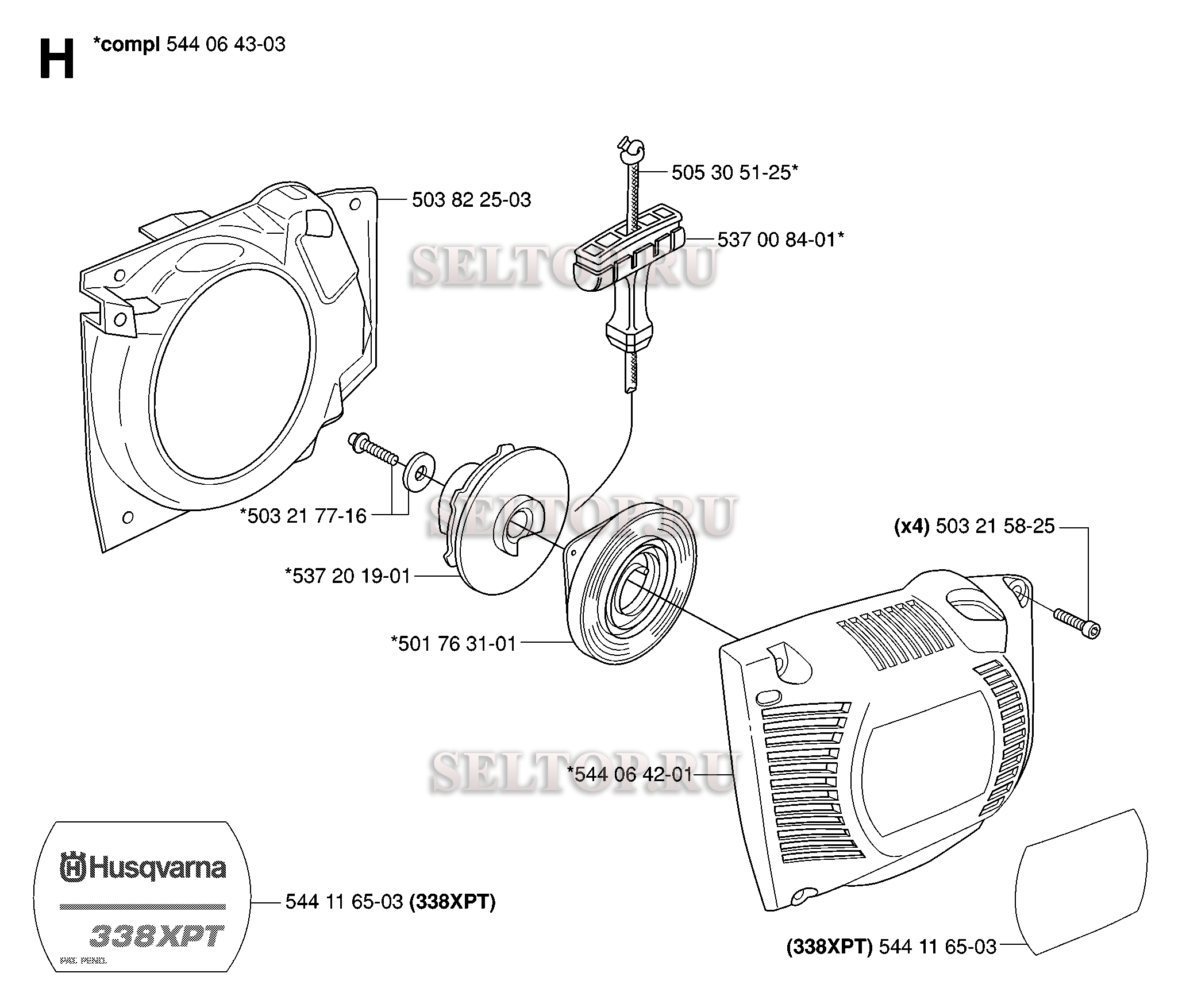 Стартер для бензопилы Husqvarna 338 XPT (с 2006-09), взрыв-схема: