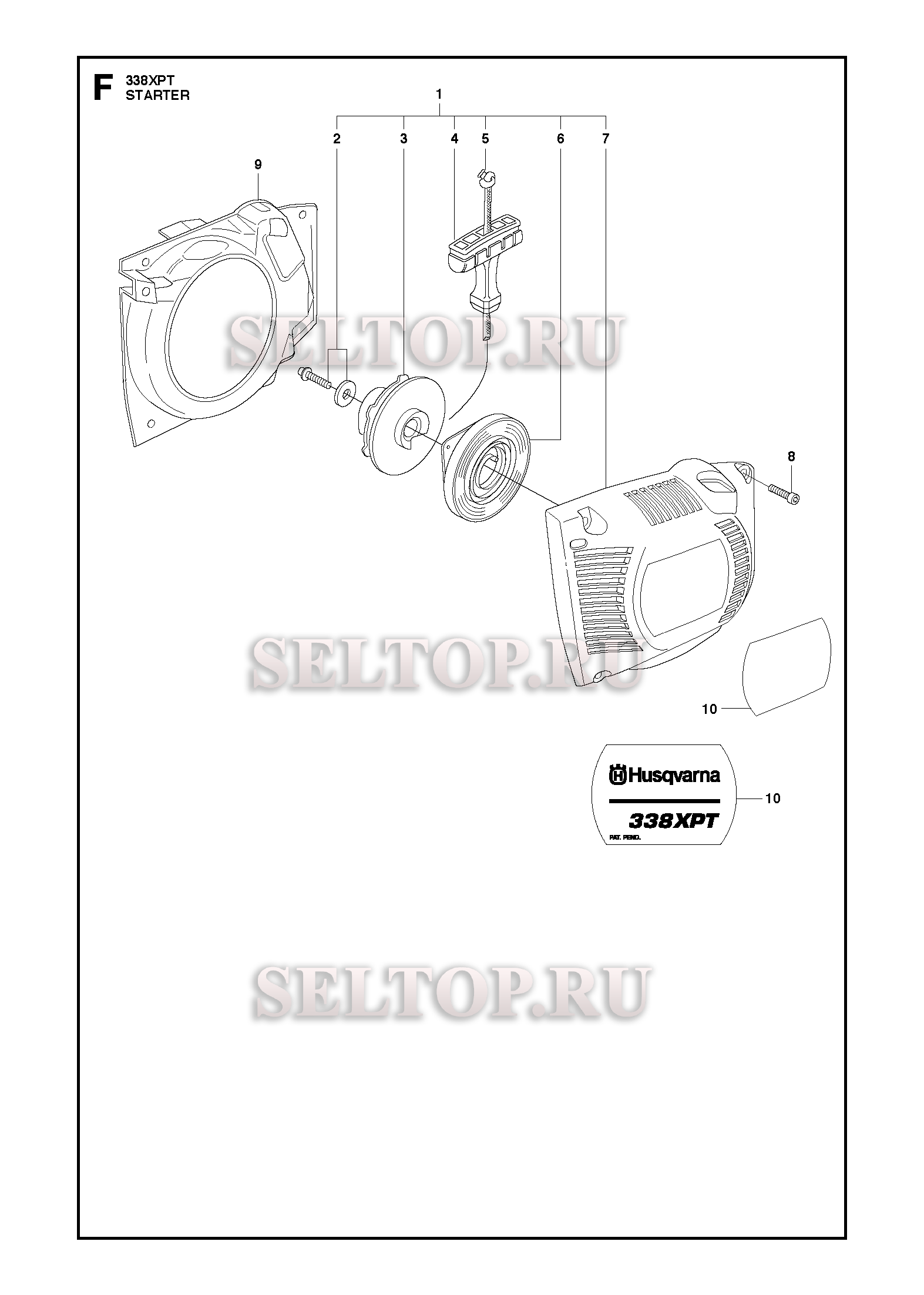 Стартер для бензопилы Husqvarna 338 XPT (с 2010-02), взрыв-схема: