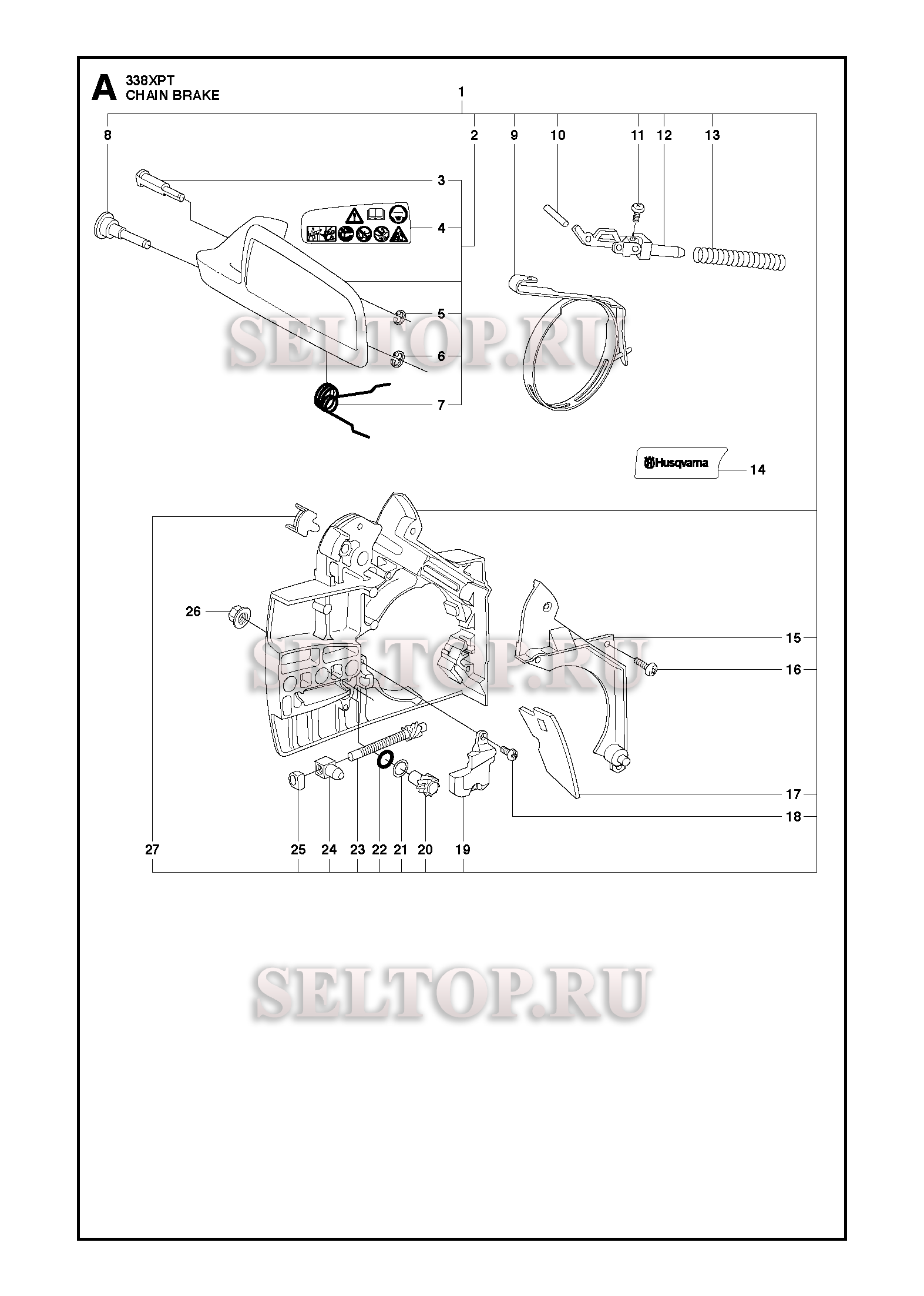 Тормоз цепи для бензопилы Husqvarna 338 XPT (с 2010-02), взрыв-схема: