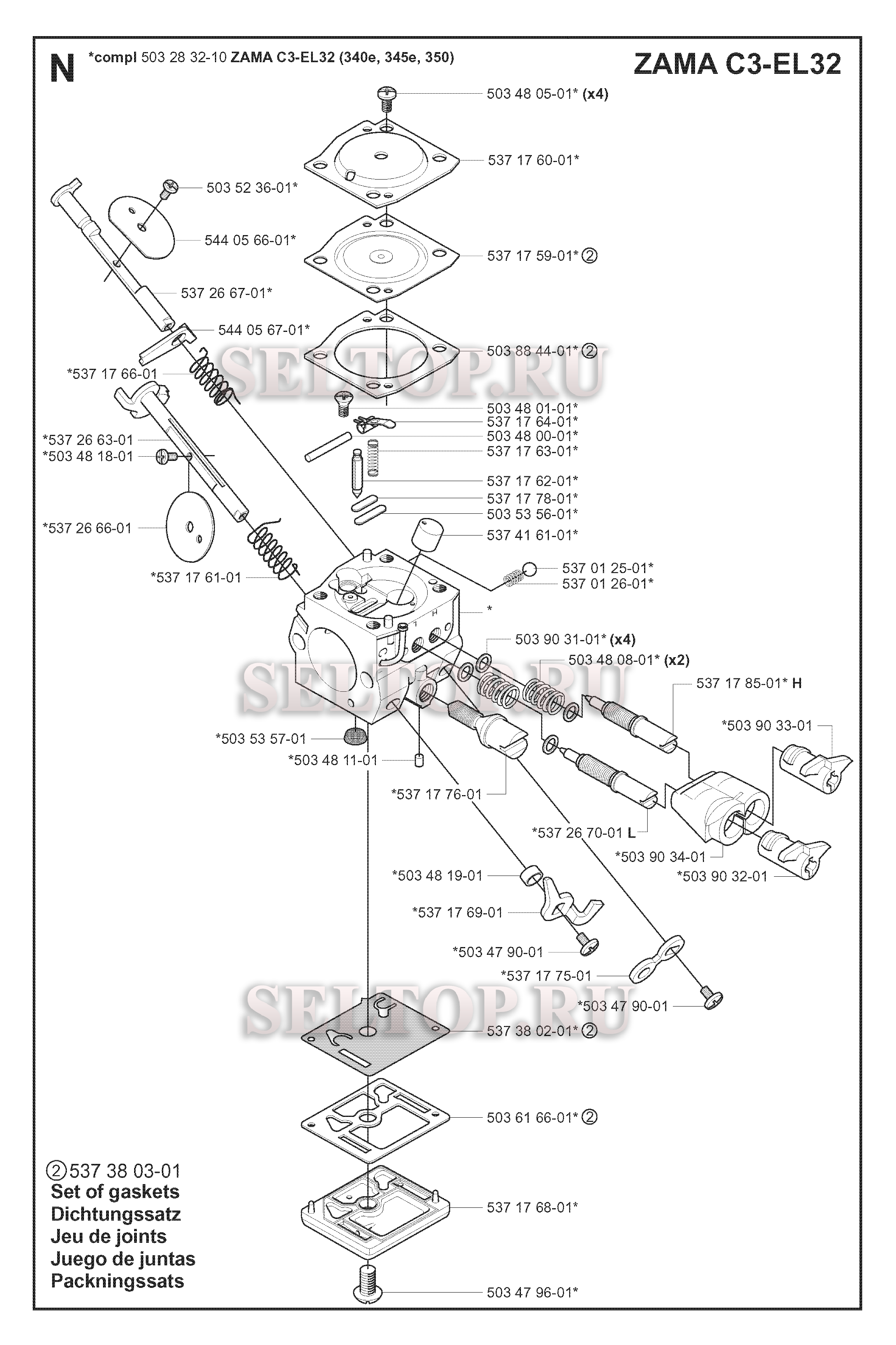 Карбюратор для бензопилы Husqvarna 340 (с 2007-01), взрыв-схема: