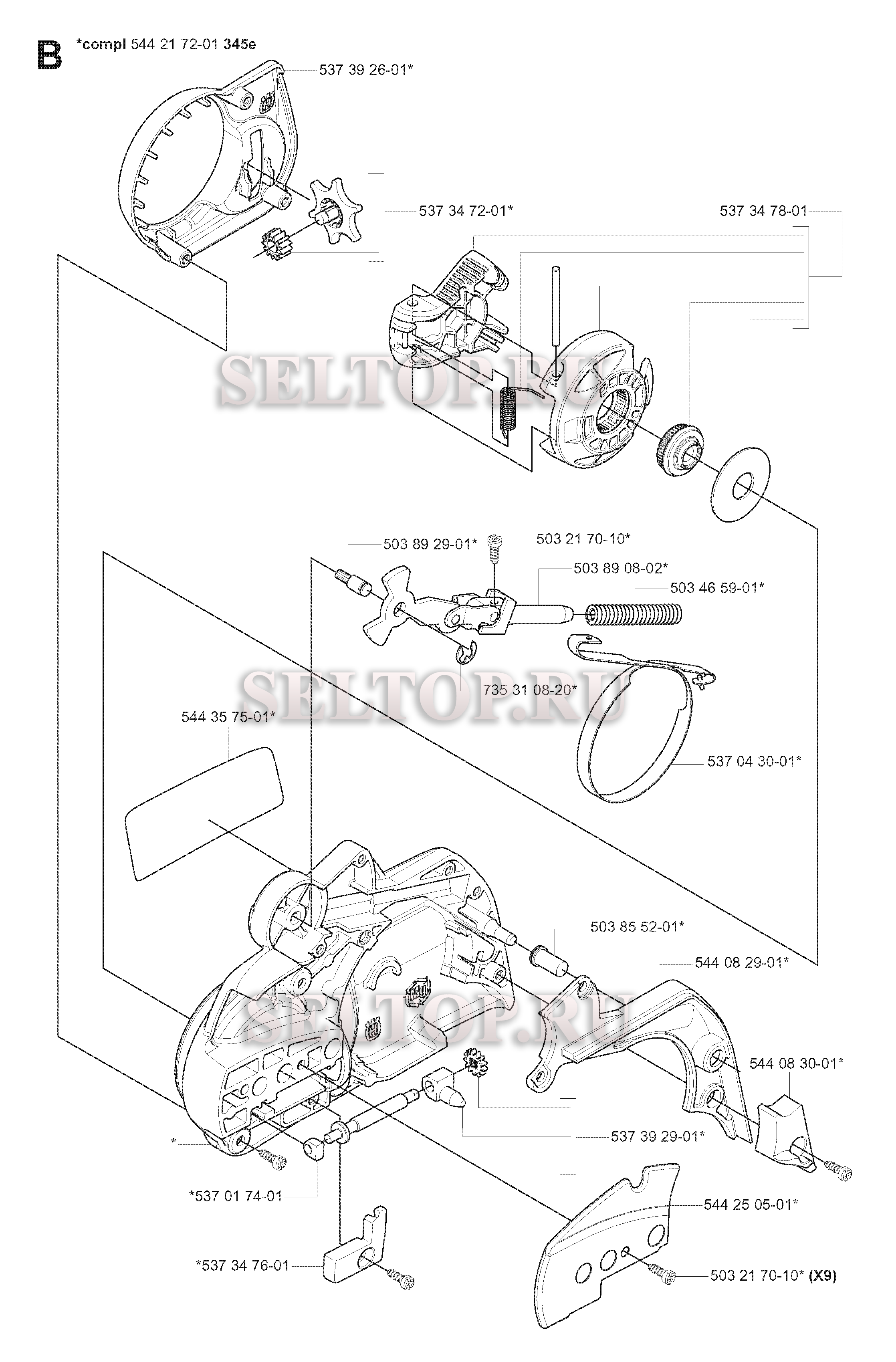 Крышка сцепления для бензопилы Husqvarna 340 (с 2007-01), взрыв-схема: