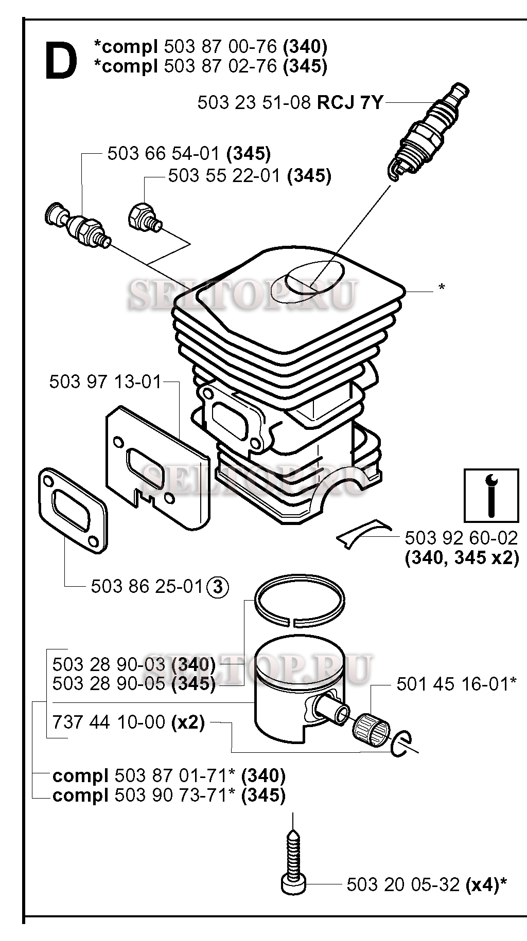 Поршень, цилиндр для бензопилы Husqvarna 345 (с 2004-03), взрыв-схема: