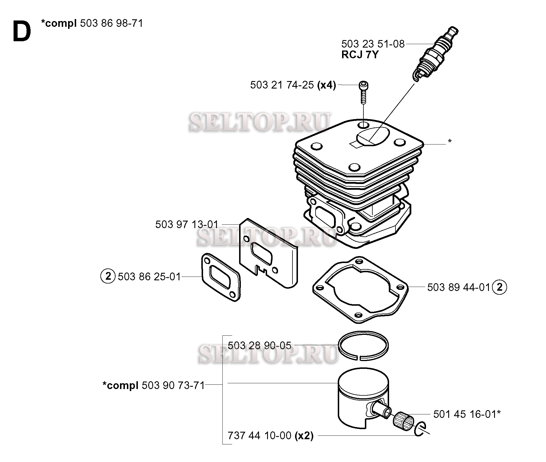 Поршень, цилиндр для бензопилы Husqvarna 346 XP (с 2003-06), взрыв-схема: