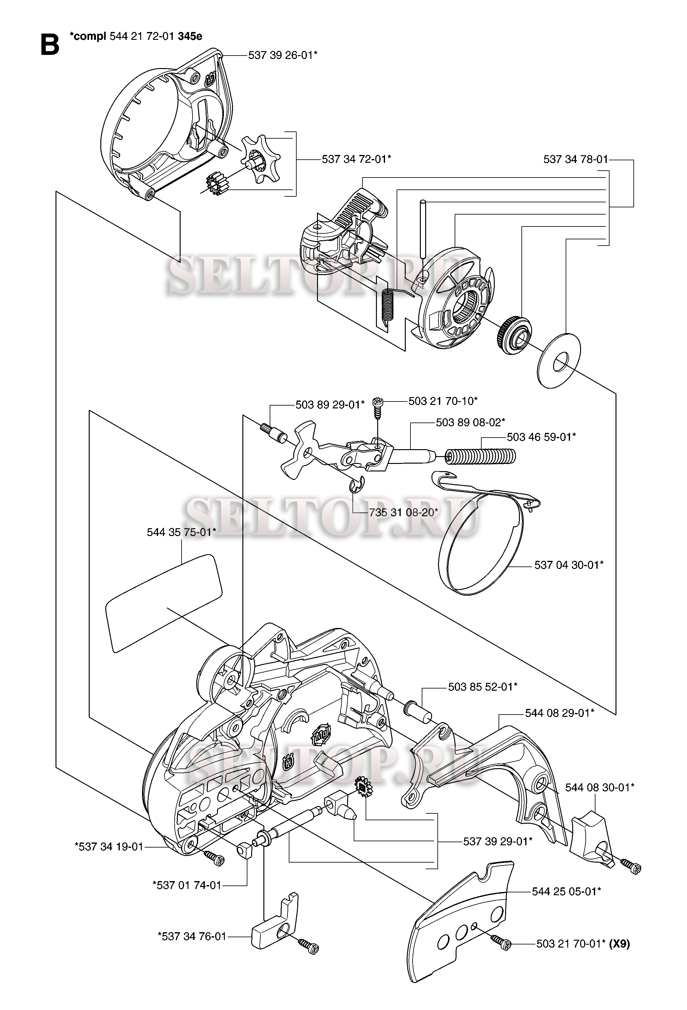 Тормоз цепи для бензопилы Husqvarna 350 (с 2006-06), взрыв-схема: