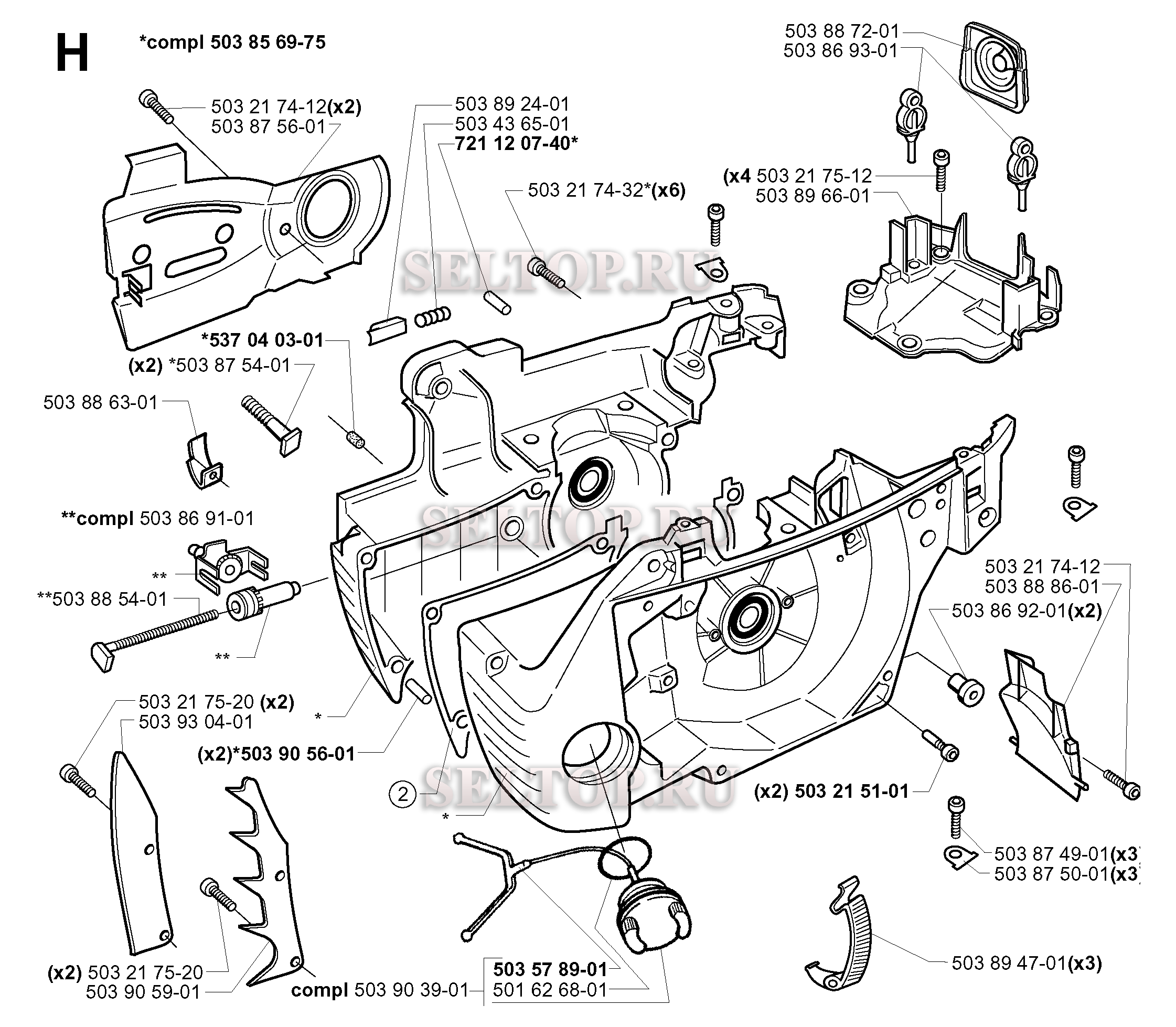 Картер для бензопилы Husqvarna 351 EPA (с 1999-09), взрыв-схема: