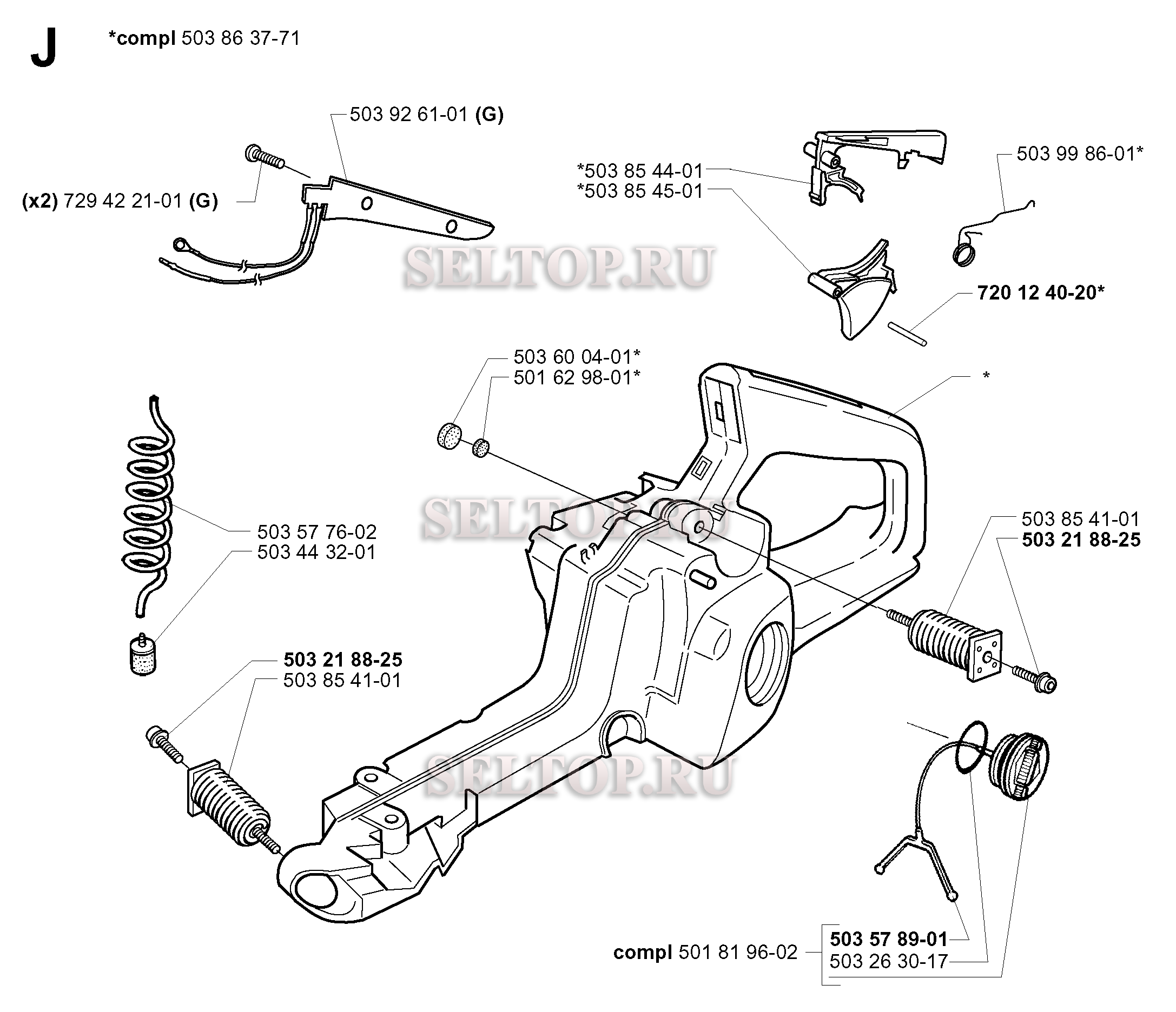 Топливный бак для бензопилы Husqvarna 351 (с 1999-09), взрыв-схема: