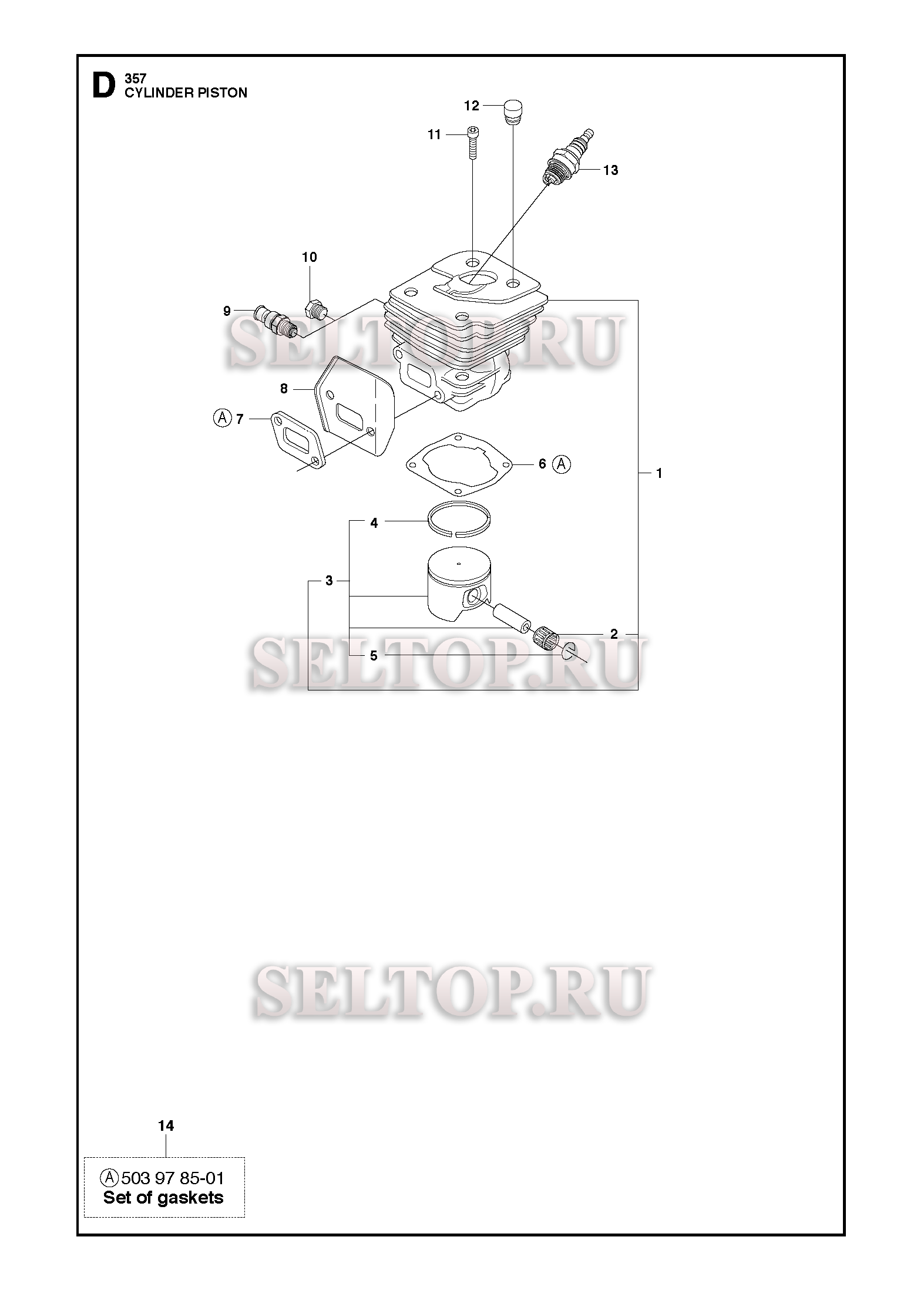 Поршень, цилиндр для бензопилы Husqvarna 357 XP (с 2011-05), взрыв-схема:
