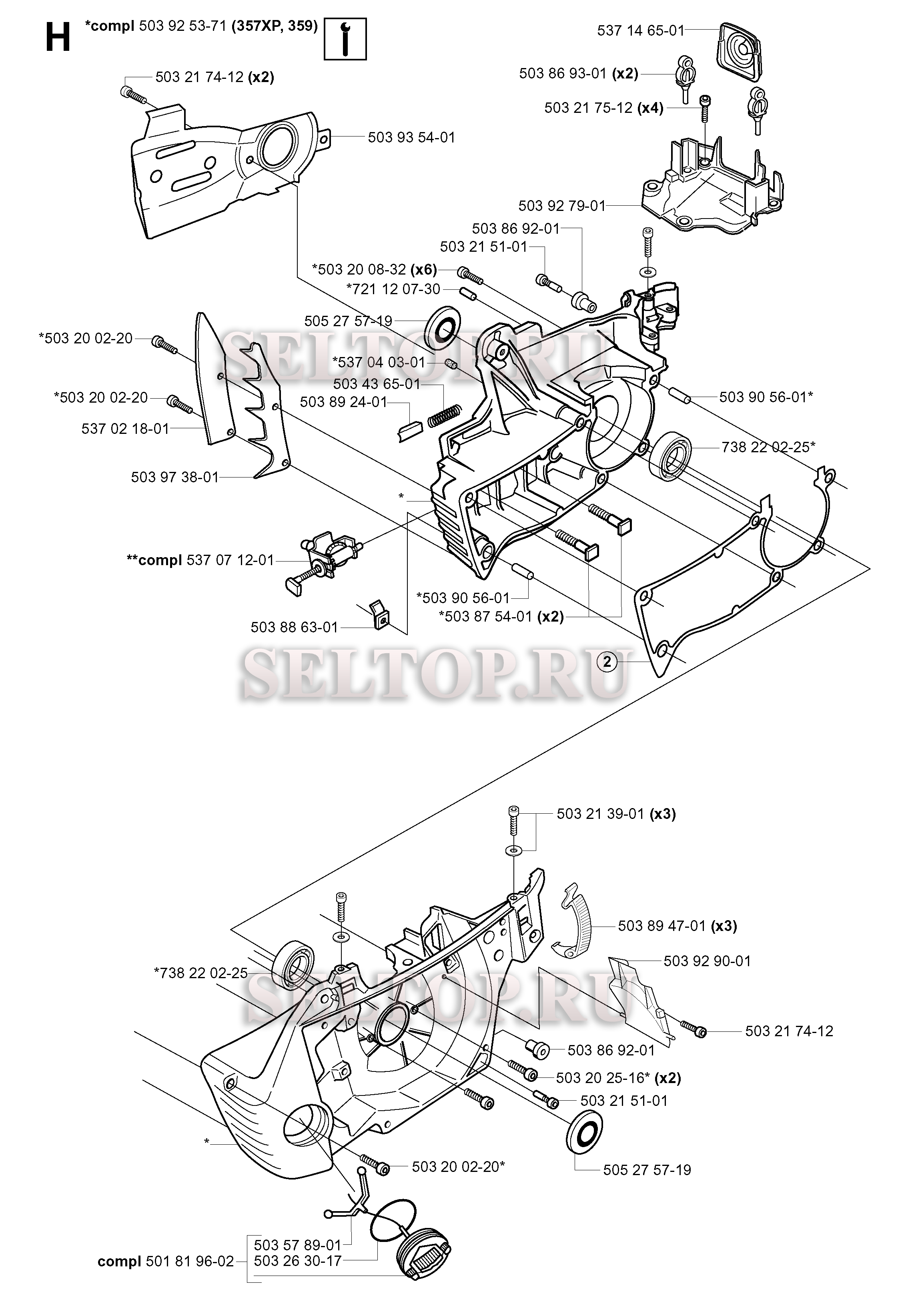Картер для бензопилы Husqvarna 359 EPA (с 2004-05), взрыв-схема: