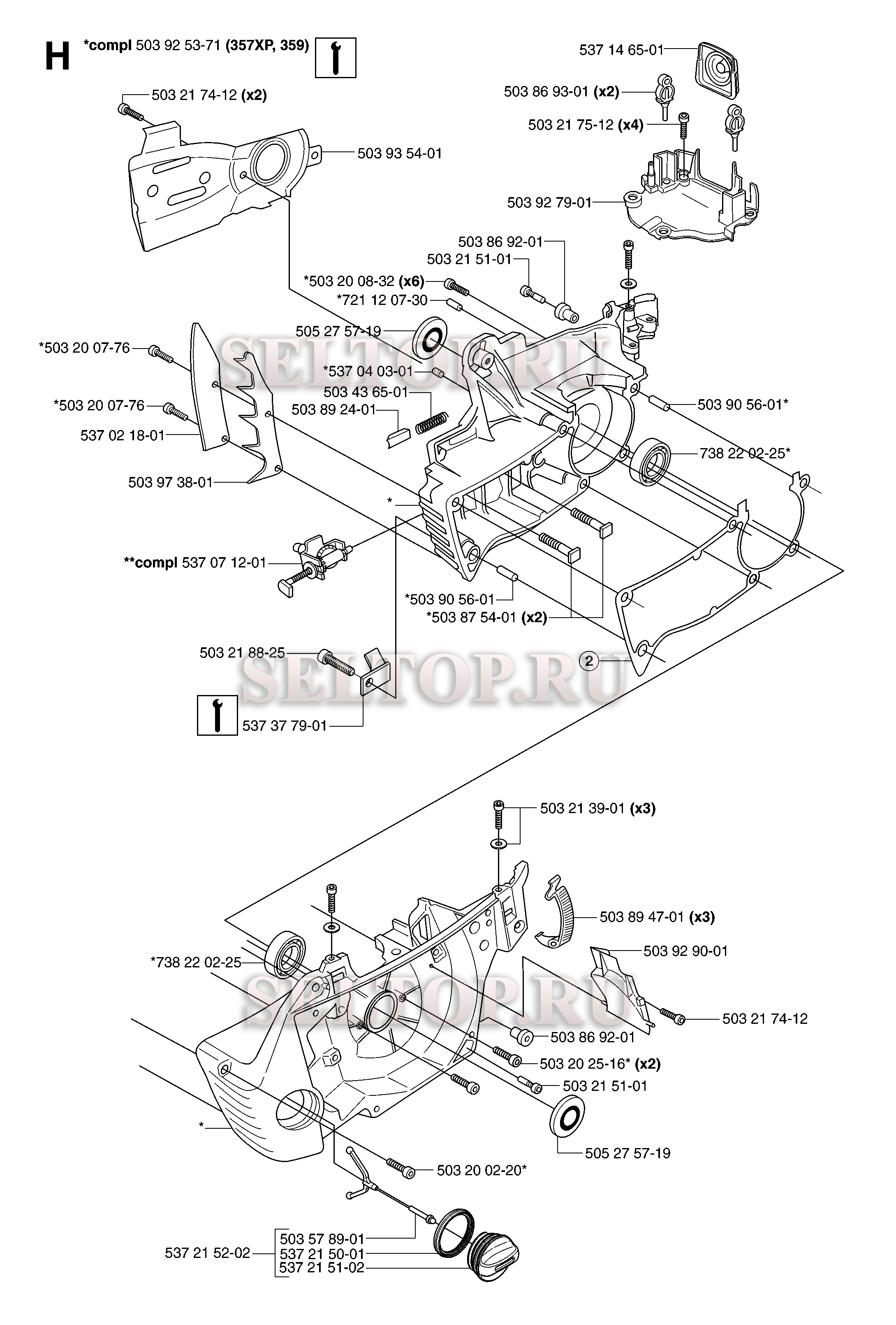 Картер для бензопилы Husqvarna 359 EPA (с 2007-03), взрыв-схема: