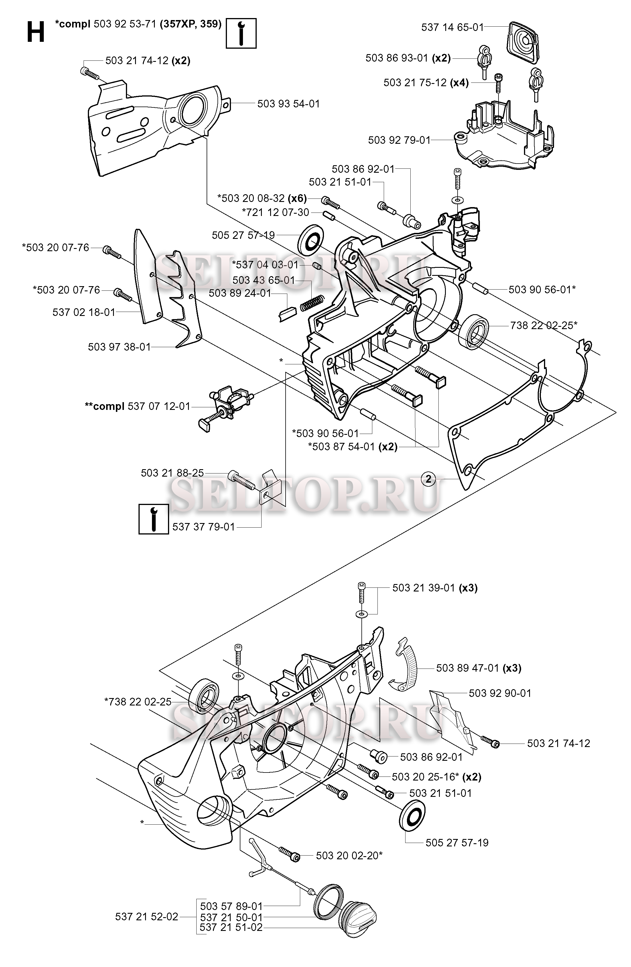 Картер для бензопилы Husqvarna 359 (с 2005-02), взрыв-схема: