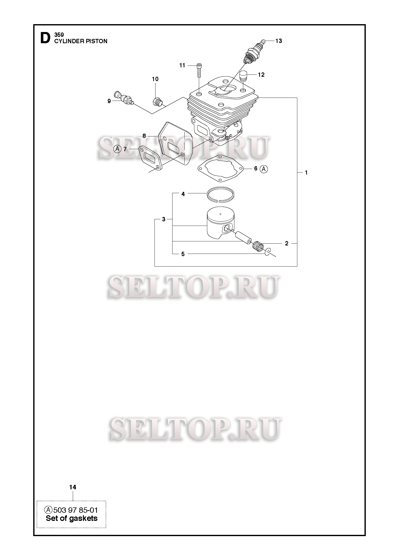 Поршень, цилиндр для бензопилы Husqvarna 359 (с 2011-05), взрыв-схема: